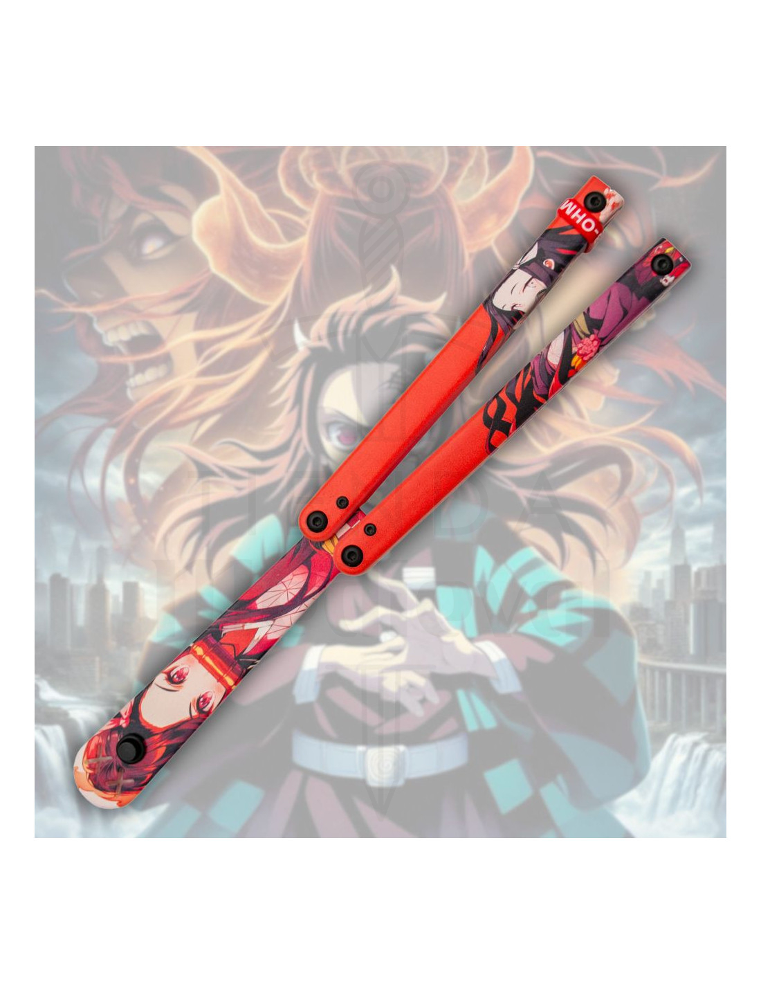 Der Griff, ebenfalls aus Kunststoff und mit 3D-Druck, zeigt ein von Nezuko inspiriertes Design, das einen bequemen Halt mit einer ansprechenden visuellen Ästhetik kombiniert. Mit einer Gesamtlänge von 25 cm und einem leichten Gewicht von 58 Gramm ermöglicht dieses Messer eine agile und bequeme Handhabung, perfekt für diejenigen, die ihre Fächertechniken verbessern oder ihr Cosplay von Nezuko ergänzen möchten.