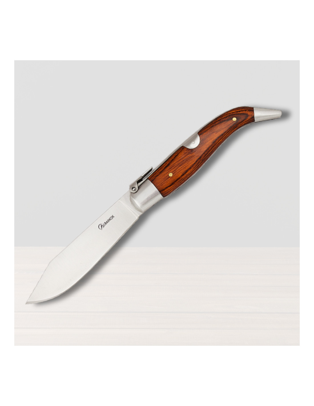 Seine 11 cm lange Klinge, gefertigt aus Kohlenstoffstahl mit satiniertem Finish, bietet außergewöhnliche Präzision und eine langlebige Schneide, die jeden Schnitt sanft und effizient macht. Die gebogene Form und das glänzende Finish verleihen nicht nur einen Hauch von Eleganz, sondern auch eine einfache Handhabung, die bequem in der Hand liegt. Die Aluminium-Backe und verstärkte Futter sorgen für eine stabile und leichte Struktur, perfekt für den täglichen Gebrauch oder Outdoor-Aktivitäten.