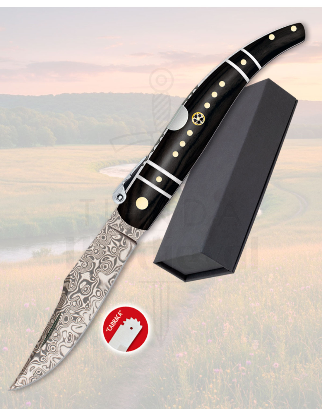 Wenn Sie sich entschieden haben, ein markantes Stück zu erwerben, vereint die Option, das Sammlermesser aus Damaszenerstahl, Ratsche, schwarzer Griff zu kaufen, die Persönlichkeit des Designs, die Funktionalität des Mechanismus und eine gepflegte Präsentation, alles gedacht für diejenigen, die mehr als ein Werkzeug suchen, ein Stück mit Charakter.