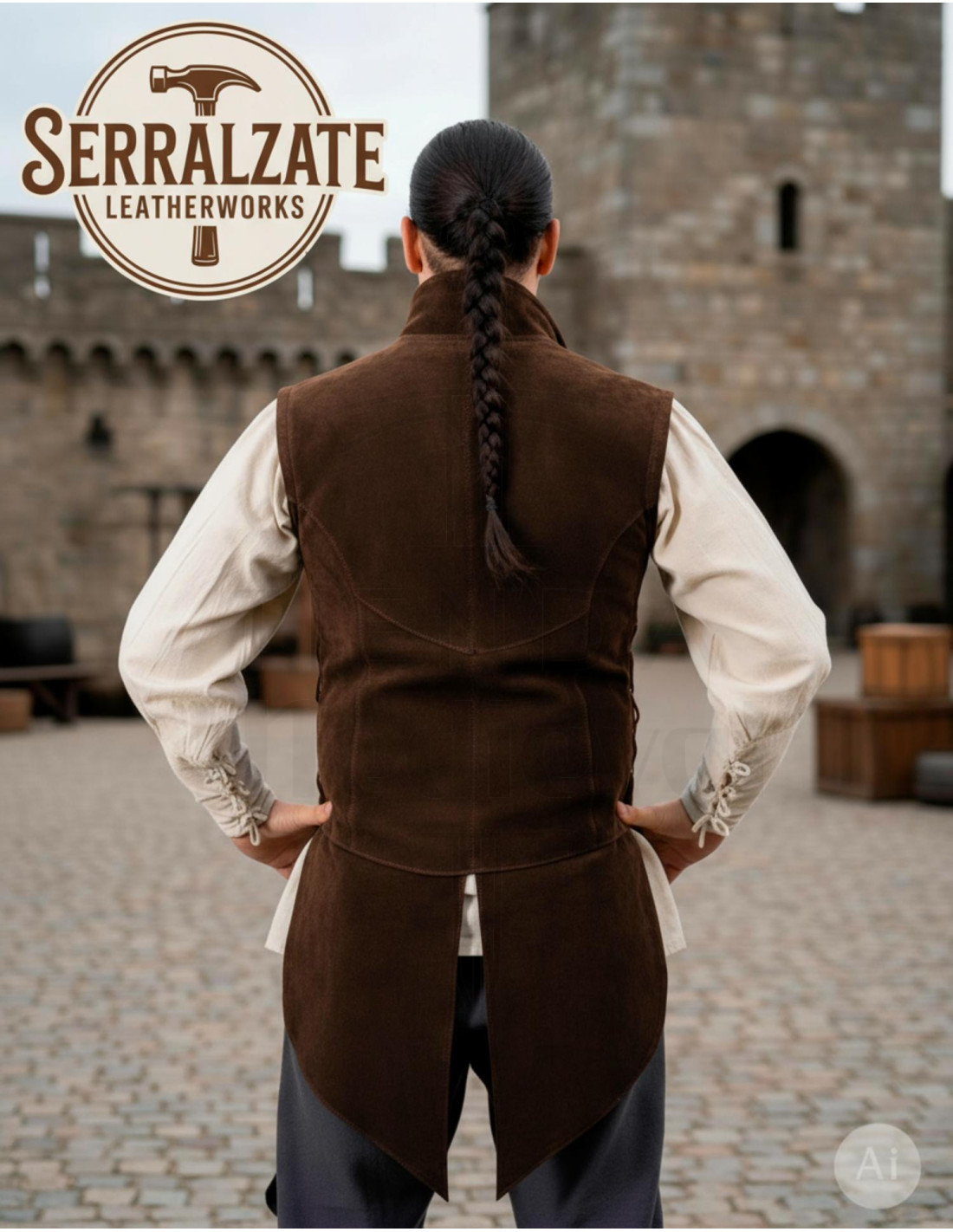 Die verstellbare mittelalterliche Weste Arturo aus dunkelbraunem Wildleder vereint rustikale Eleganz und die notwendige Funktionalität, um jedes Outfit in eine überzeugende Nachbildung zu verwandeln. Von den Handwerkern von Serralzate LeatherWorks handgefertigt, vermittelt jedes Detail Sorgfalt, Langlebigkeit und eine authentische Präsenz, die sofort spürbar ist. Aus echtem Wildleder gefertigt, verleiht der tiefe Braunton Seriosität und Vielseitigkeit, ideal für alle, die einen mittelalterlichen Look mit einem Hauch von Raffinesse suchen.