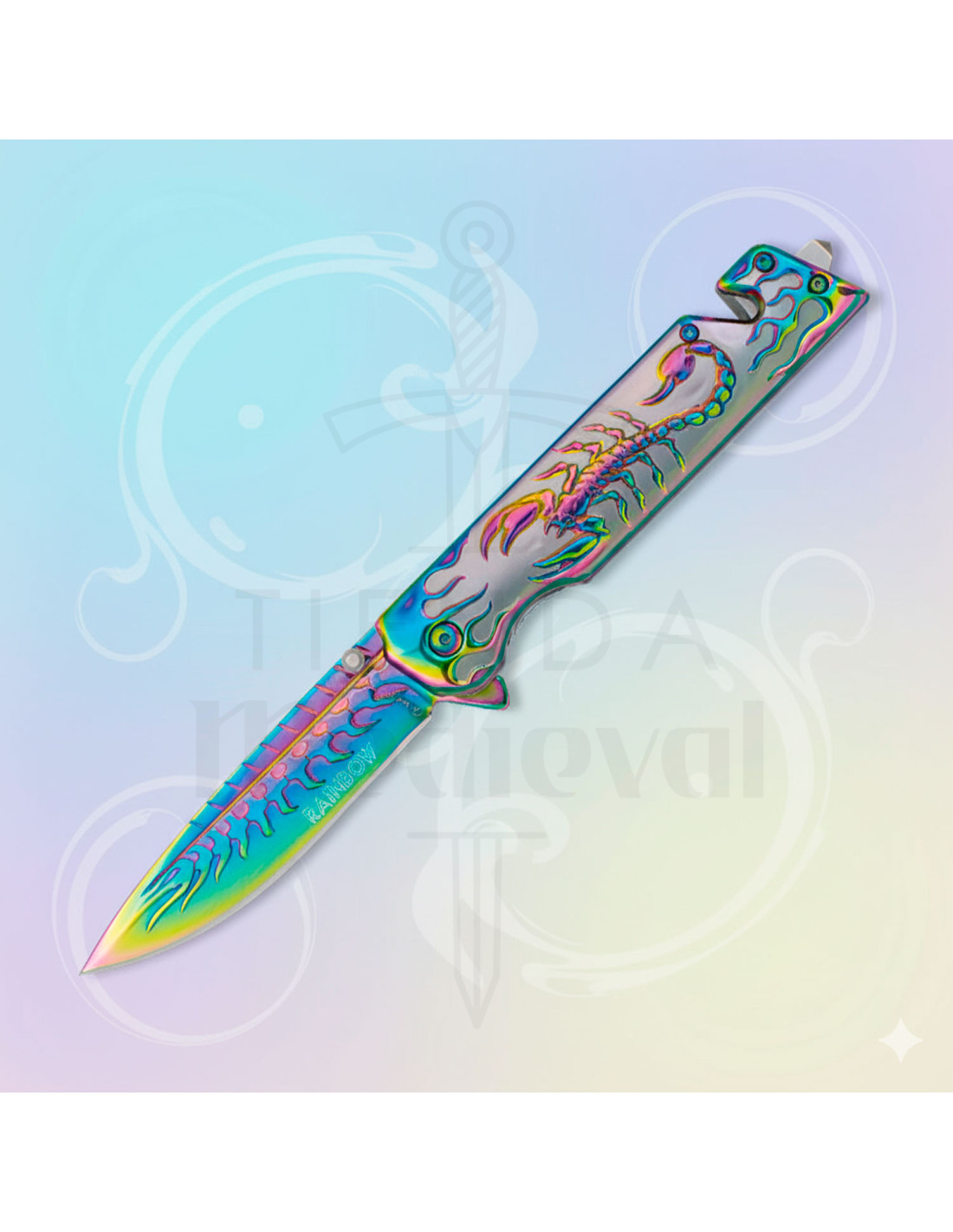 Suchen Sie ein Werkzeug, das Funktionalität und einzigartigen Stil vereint? Dieses Rettungsmesser Albainox Modell Rainbow Skorpion ist perfekt für diejenigen, die in jeder Situation hervorstechen möchten. Das mehrfarbige Rainbow-Finish, das Töne wie Blau, Grün, Gelb und Rosa reflektiert, macht es zu einem auffälligen Stück voller Persönlichkeit.