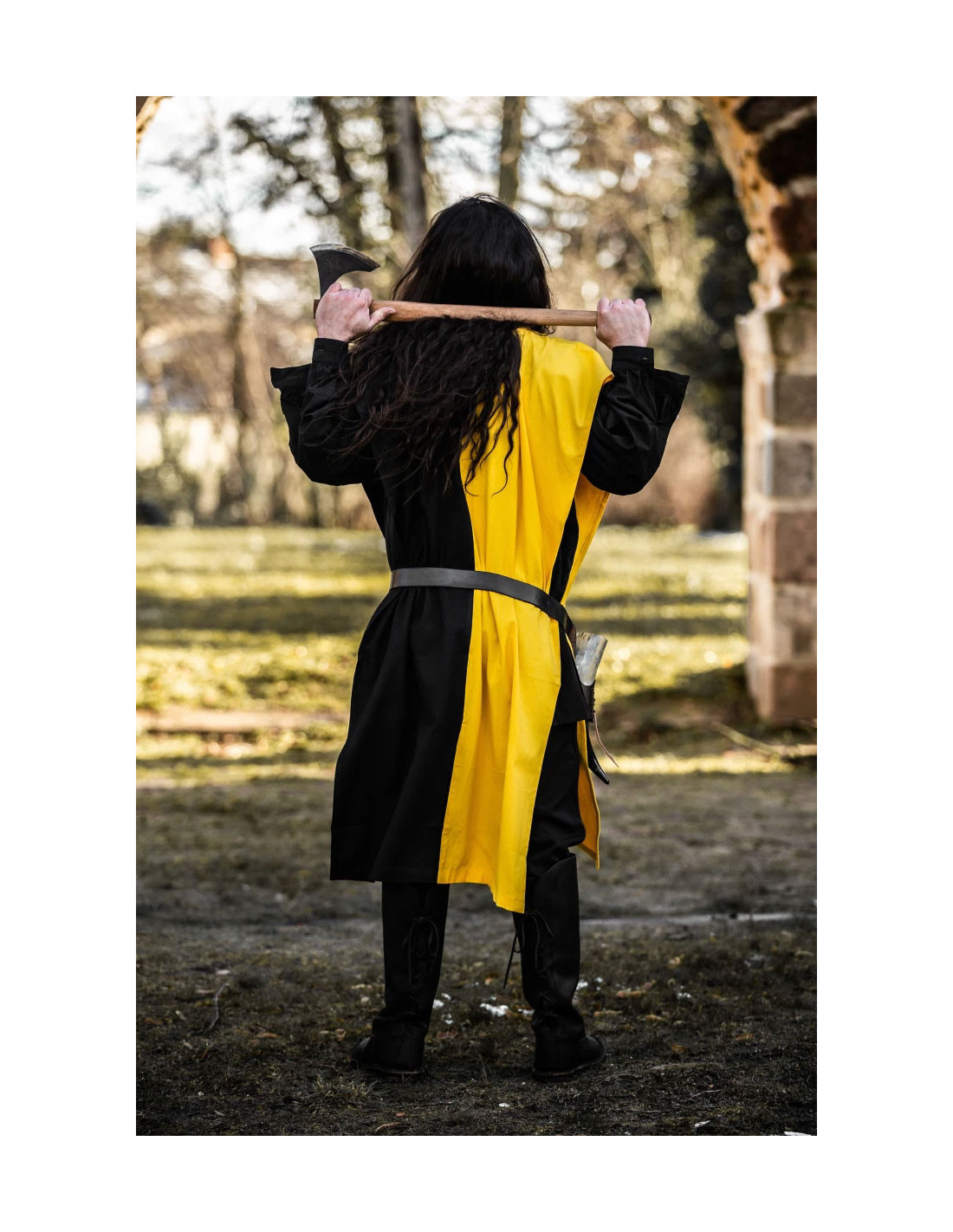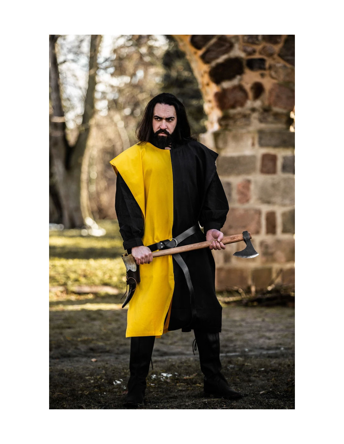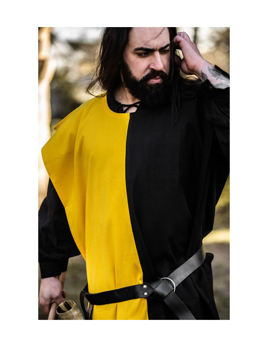 Möchten Sie Ihren mittelalterlichen Outfits einen Hauch von Energie und Vitalität verleihen? Die zweiteilige mittelalterliche Frojoerick-Tunika in Schwarz und Gelb ist die perfekte Wahl. Diese aus 100 % Baumwolle gefertigte Tunika ist bequem und langlebig und eignet sich daher ideal für jede historische Nachstellungsveranstaltung.