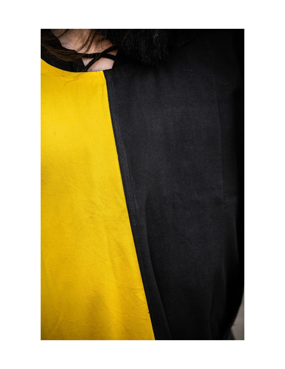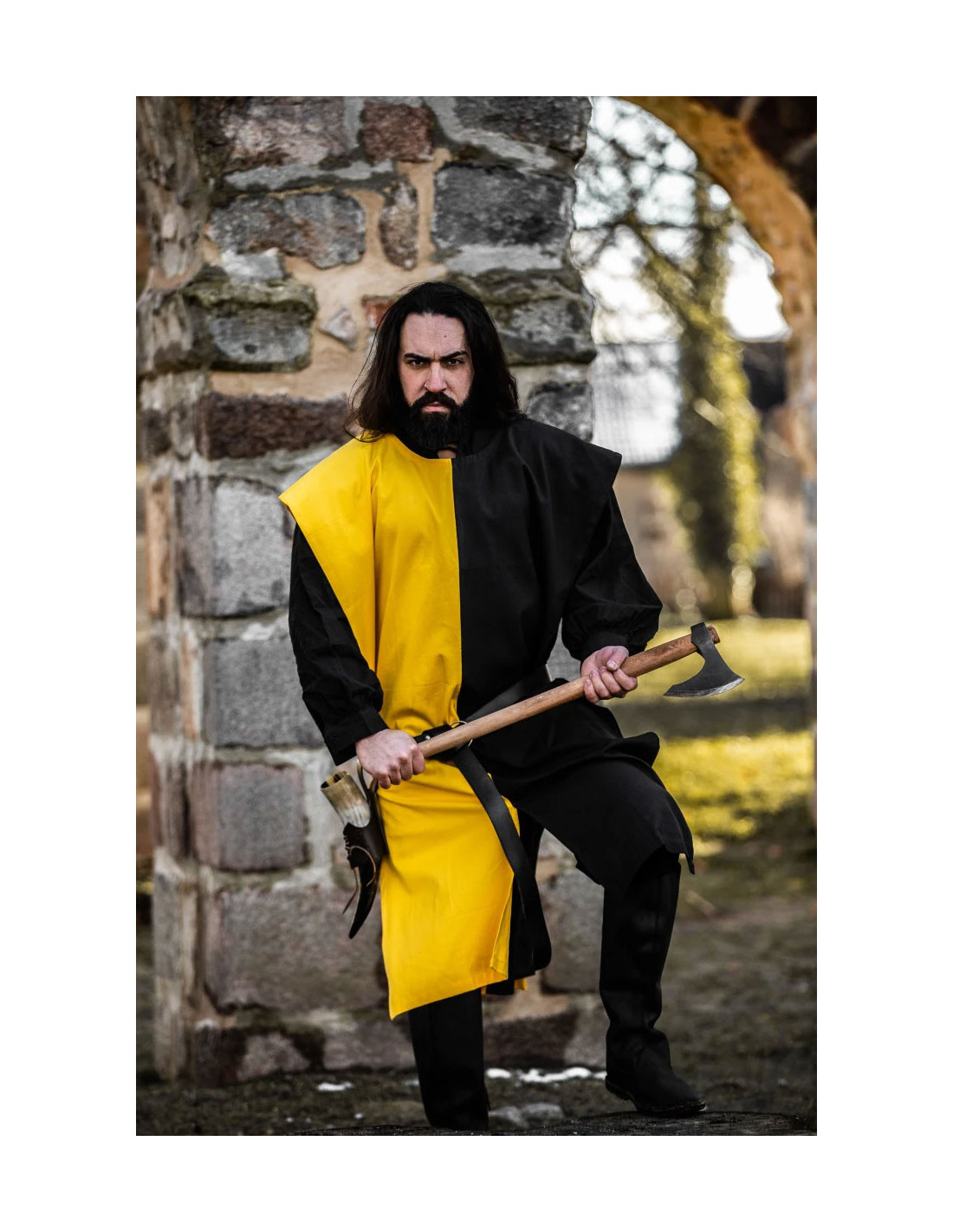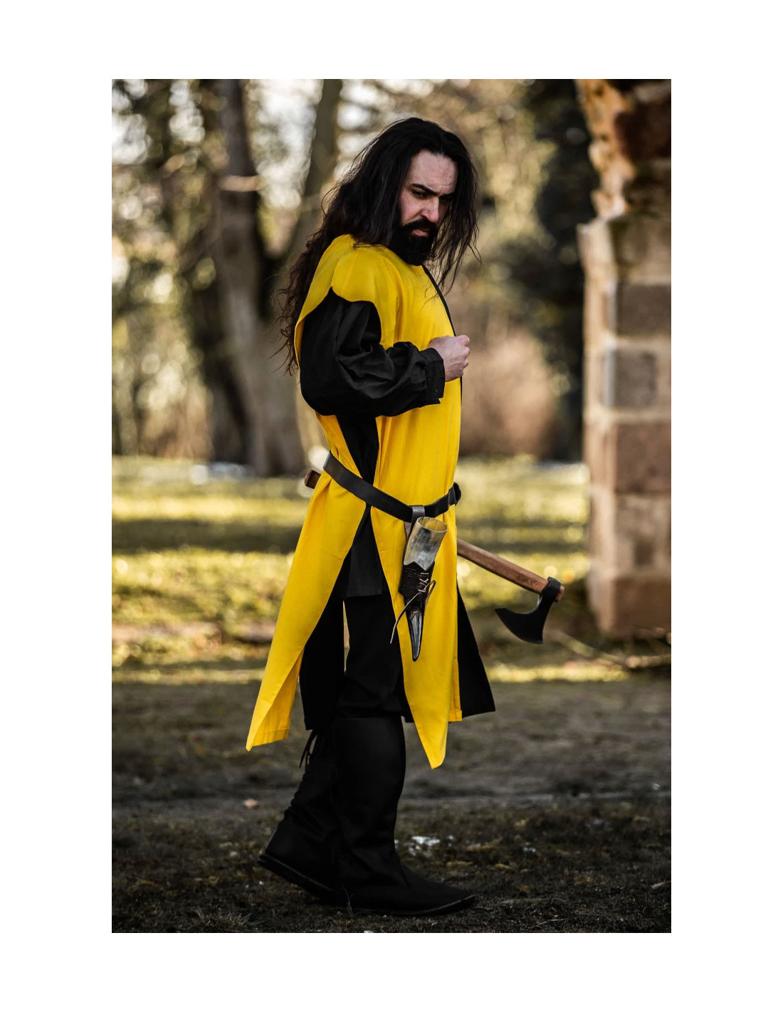 Möchten Sie Ihren mittelalterlichen Outfits einen Hauch von Energie und Vitalität verleihen? Die zweiteilige mittelalterliche Frojoerick-Tunika in Schwarz und Gelb ist die perfekte Wahl. Diese aus 100 % Baumwolle gefertigte Tunika ist bequem und langlebig und eignet sich daher ideal für jede historische Nachstellungsveranstaltung.