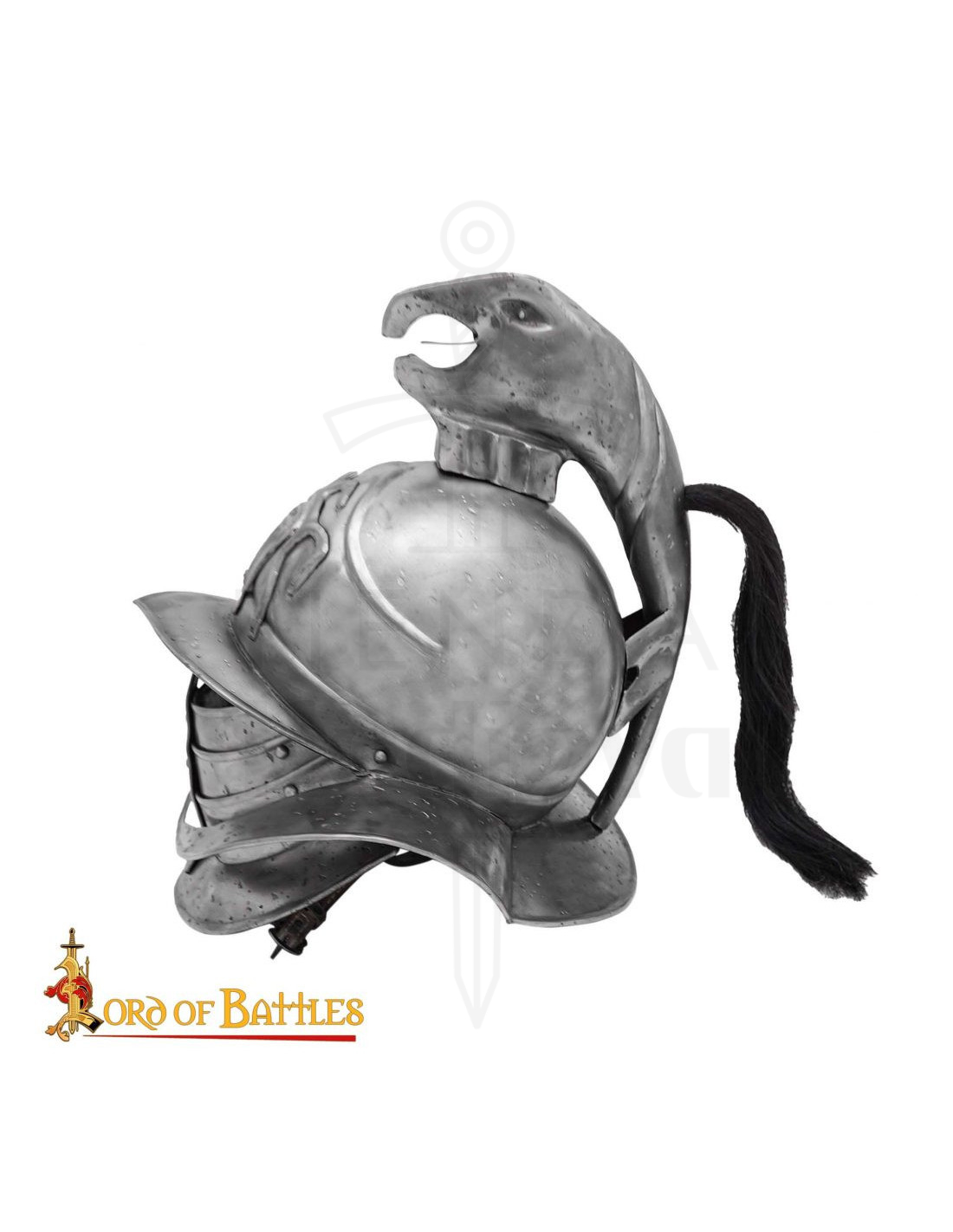 Dieses aus Stahl geschnitzte Design bietet eine beeindruckende Präsenz, die von Widerstandskraft und Charakter spricht, dank seiner gealterten Oberfläche, die die Kampfspuren simuliert und ihm ein authentisches und dramatisches Aussehen verleiht. Der Adlerkampf mit seiner Form und das erhabene Vorderteil verleihen dieser Maske das symbolische Zeichen von Macht und Herausforderung, wodurch der Helm zu einem Blickfang wird, der Geschichten weckt.