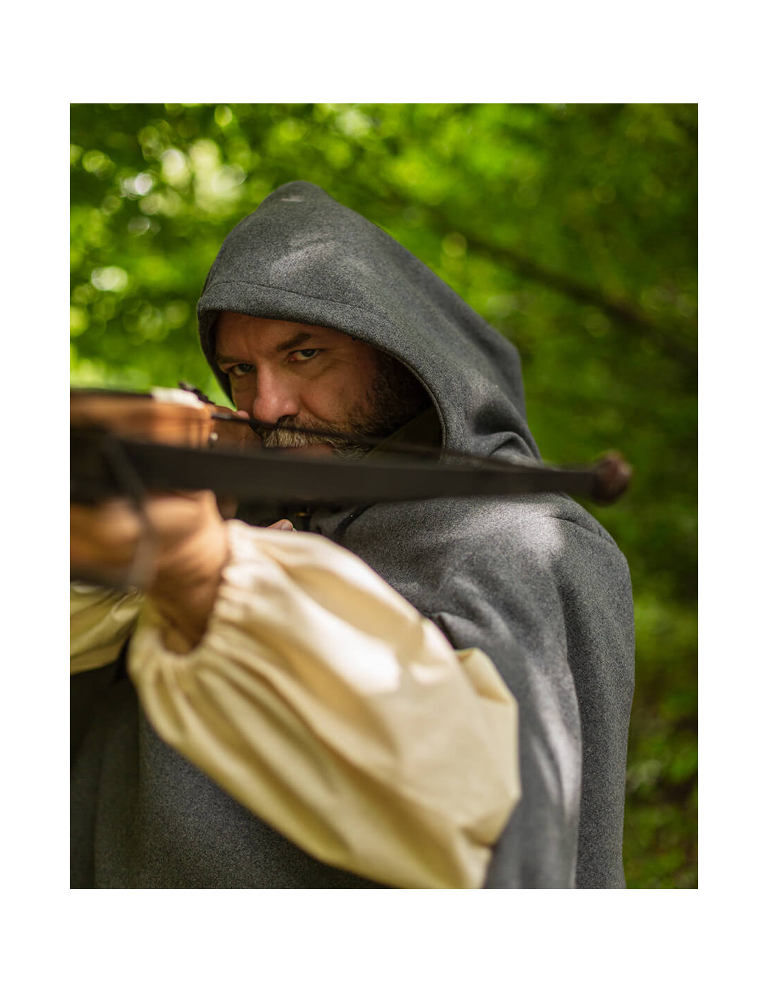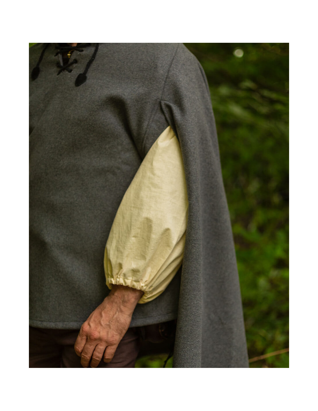 Entdecken Sie den Renaissance-Umhang aus Wolle, Modell Raven, in elegantem Grau. Der Umhang „Raven“ ist ein treuer Begleiter in den verschiedensten Situationen und Wetterlagen. Locker geschnitten und vorne kürzer als hinten, bietet es viel Bewegungsfreiheit und garantiert Tragekomfort. Durch die Armöffnungen können Sie Ihre Hände bequem nutzen, ohne den Umhang über der Schulter tragen oder ausziehen zu müssen. Darüber hinaus verfügt es über interne Reißverschlüsse, die die Öffnungen geschlossen halten, wenn Sie sie nicht verwenden.
