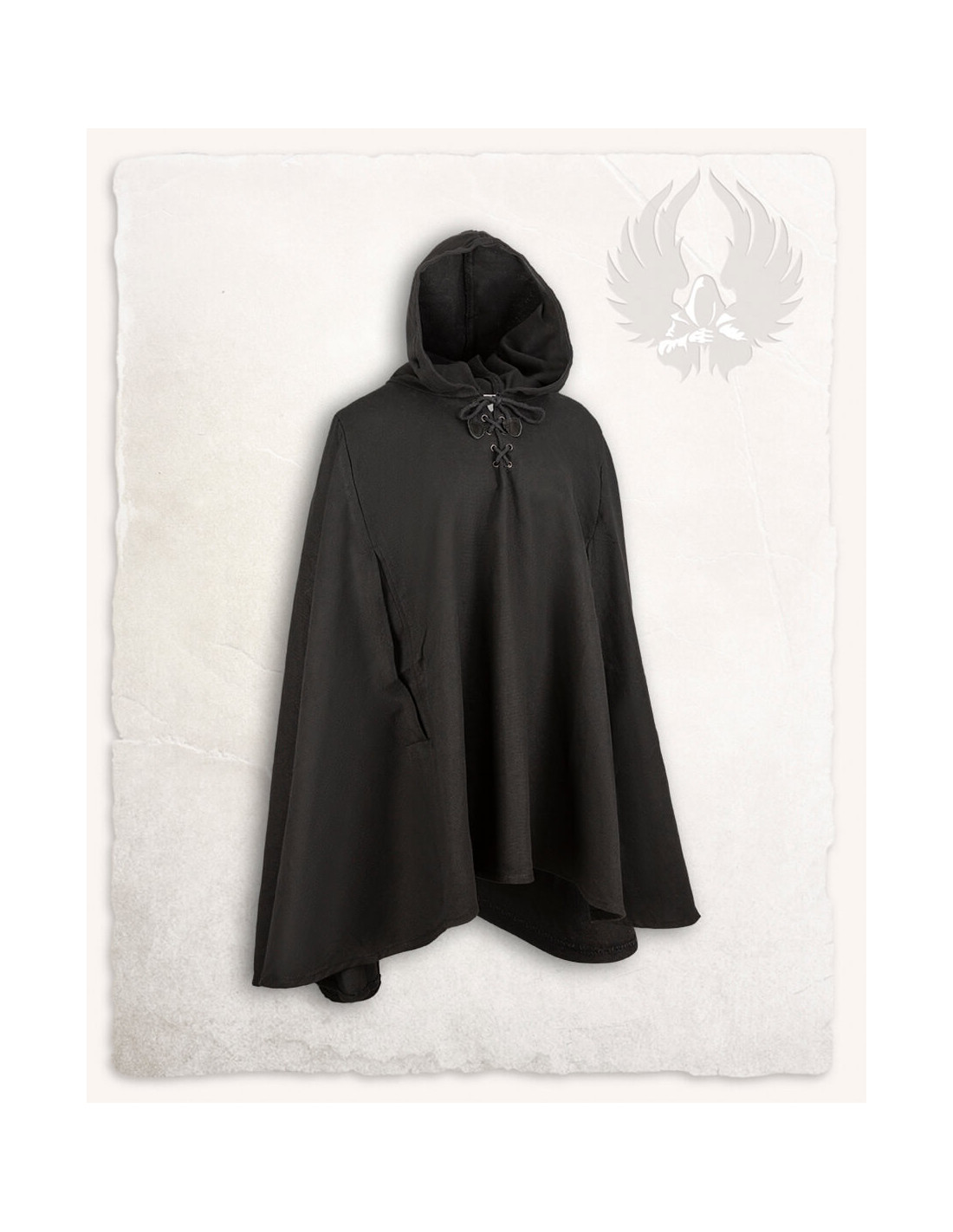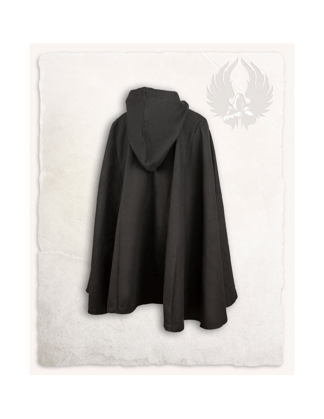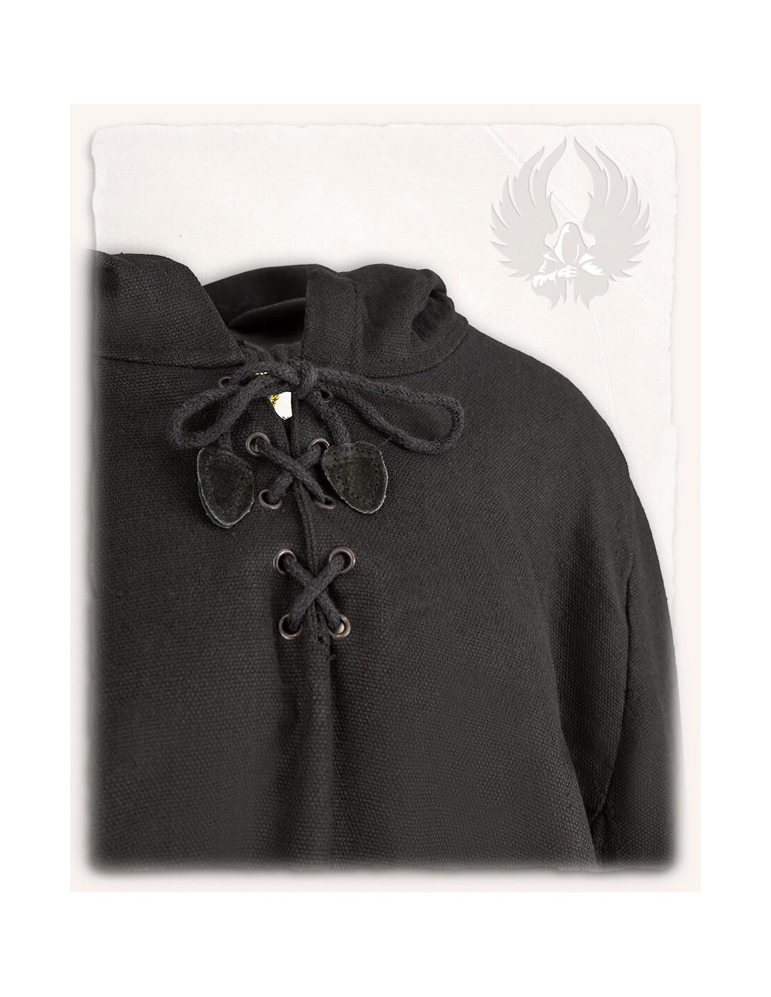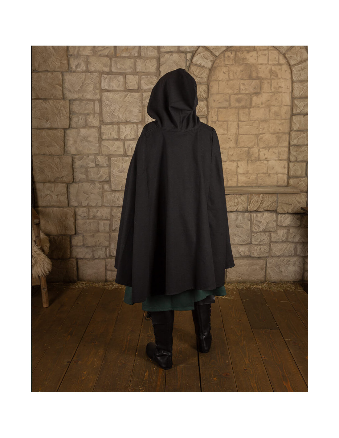 Machen Sie sich bereit für jede Herausforderung mit dem mittelalterlichen Umhang „Rabe“ in Schwarz! Dieser Umhang, der aufgrund seines charakteristischen kurzen Schnitts vorne und des langen Rückens „Krähe“ genannt wird, wird Sie in den unterschiedlichsten Situationen und Wetterlagen treu begleiten. Deshalb ist das Cape „Raven“ eine kluge Wahl für alle, die Komfort und Vielseitigkeit suchen: