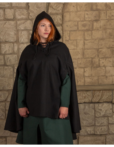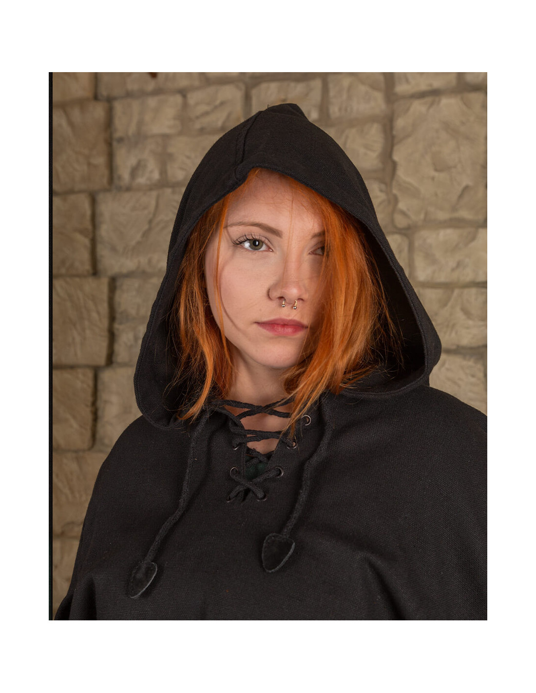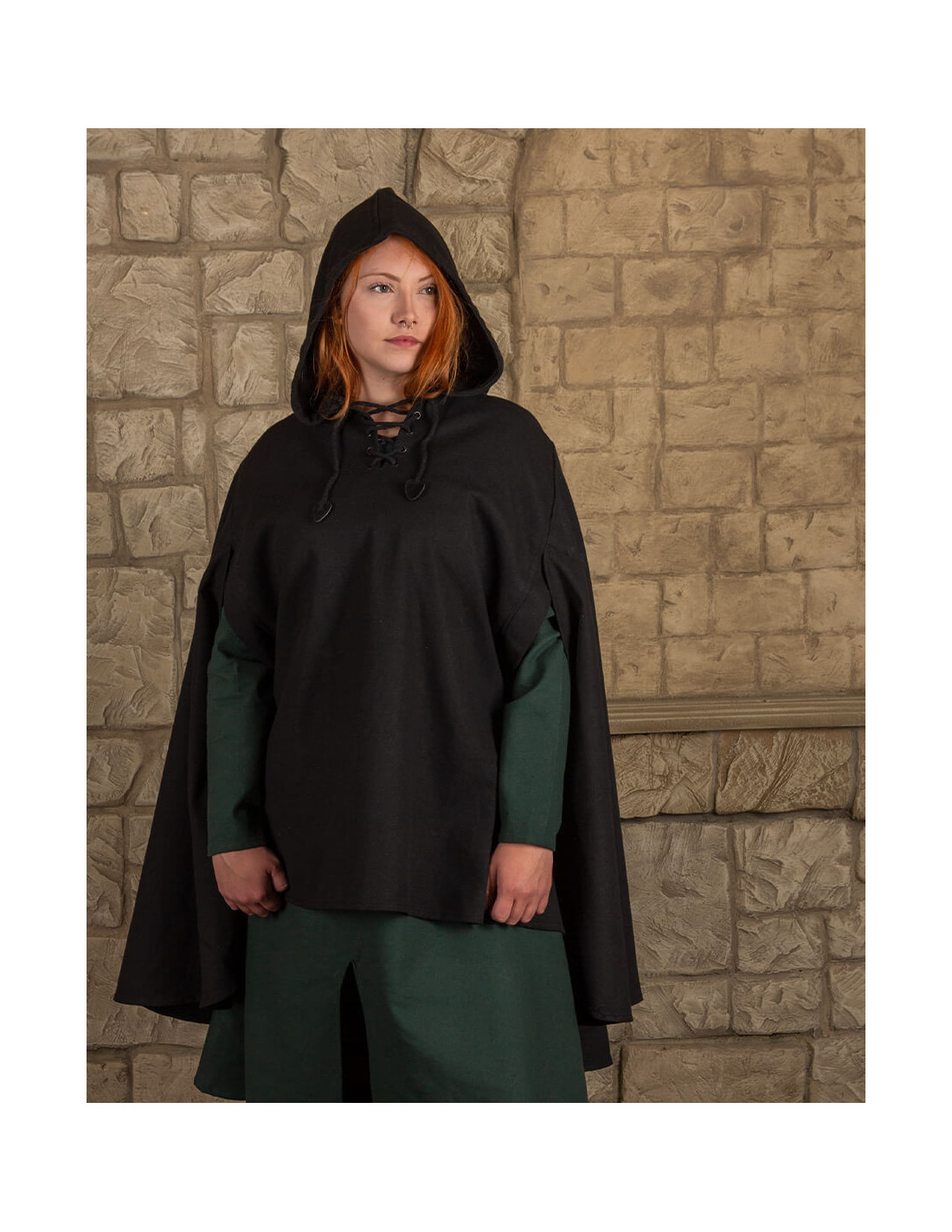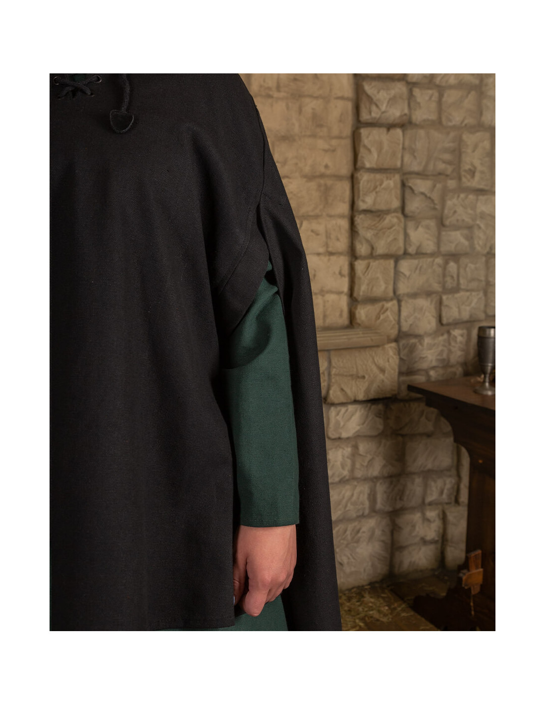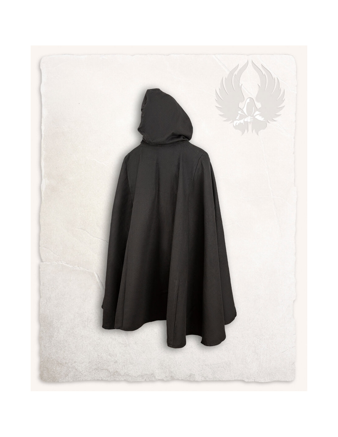 Machen Sie sich bereit für jede Herausforderung mit dem mittelalterlichen Umhang „Rabe“ in Schwarz! Dieser Umhang, der aufgrund seines charakteristischen kurzen Schnitts vorne und des langen Rückens „Krähe“ genannt wird, wird Sie in den unterschiedlichsten Situationen und Wetterlagen treu begleiten. Deshalb ist das Cape „Raven“ eine kluge Wahl für alle, die Komfort und Vielseitigkeit suchen: