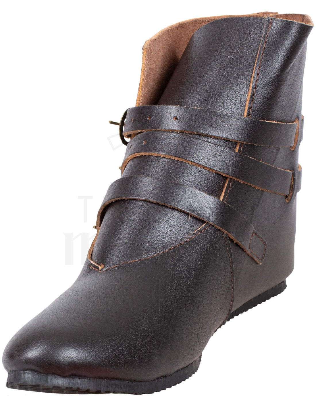 Das dicke, hochwertige Leder verleiht nicht nur ein authentisches und elegantes Aussehen, sondern schützt auch vor Schlamm und Regen, vorausgesetzt, es ist gut geölt. Die drei verstellbaren Riemen mit Schnallen ermöglichen eine perfekte Passform und bieten Komfort und Sicherheit bei jedem Schritt. Zudem verleiht das an mittelalterliche Zeiten angelehnte Design, mit einer leicht spitzen Zehenkappe, dir einen imposanten und markanten Charakter – ideal für alle, die Geschichte und Abenteuer lieben.