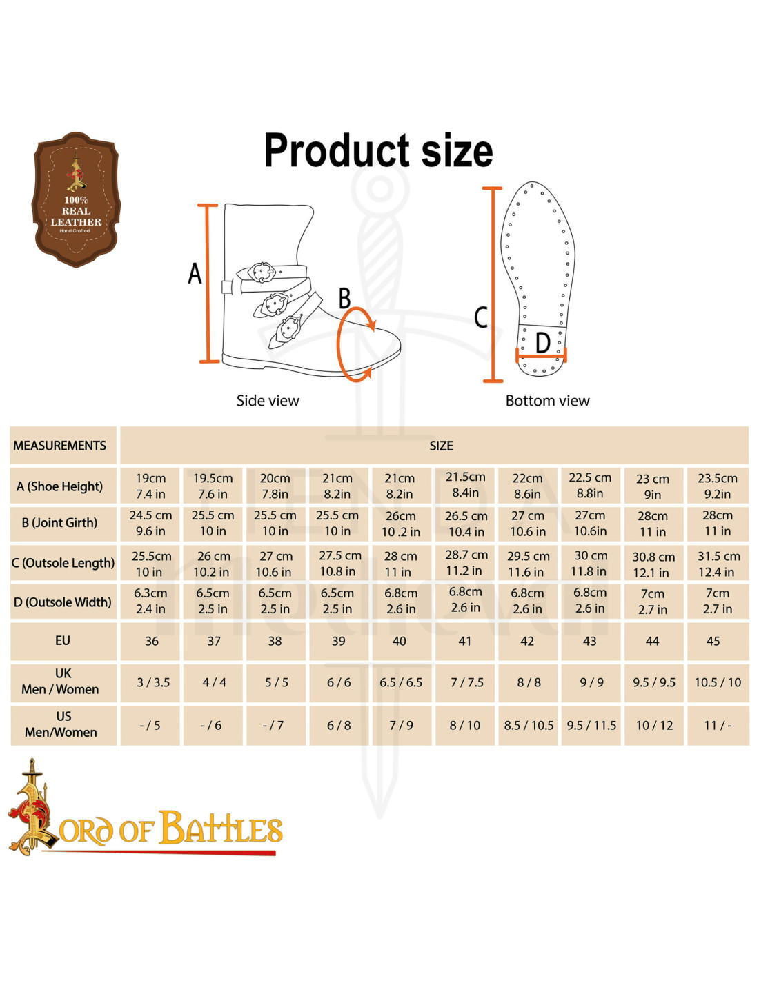Wenn Sie möchten, dass die mittelalterlichen braunen Lederstiefel des 15. Jahrhunderts mit 3 Schnallen gekauft werden, erinnern Sie daran, dass sie in Herren Größen erhältlich sind, und der enge Schnitt eine feste Passform begünstigt. Personen, die keine Herrengrößen tragen, können die Umrechnung konsultieren, um ihre beste Größe zu finden. Inspiriert von Schuhen am Ende des Mittelalters, sind sie ein perfektes Stück für Nachstellungen, Theater oder um Ihren Alltagsbekleidung einen handwerklichen und distinguierten Touch zu verleihen.