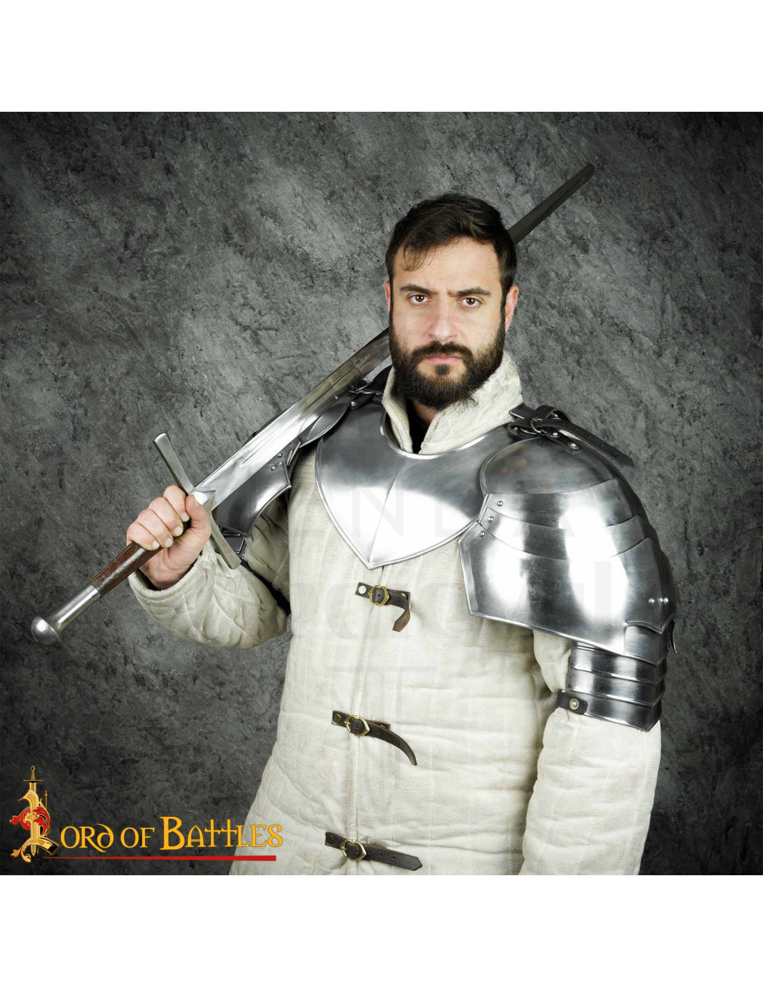 Perfekt für Renaissance-Messen, Cosplay-Veranstaltungen und ernsthafte Sammlungen, ermöglichen es Ihnen diese Schulterschützer, sich mühelos abzuheben. Ihr klassischer Stil, kombiniert mit sorgfältigen metallischen Oberflächen und einer Gelenkigkeit, die die natürliche Beweglichkeit respektiert, macht sie zur praktischen und visuell beeindruckenden Wahl für diejenigen, die Eindruck hinterlassen möchten.