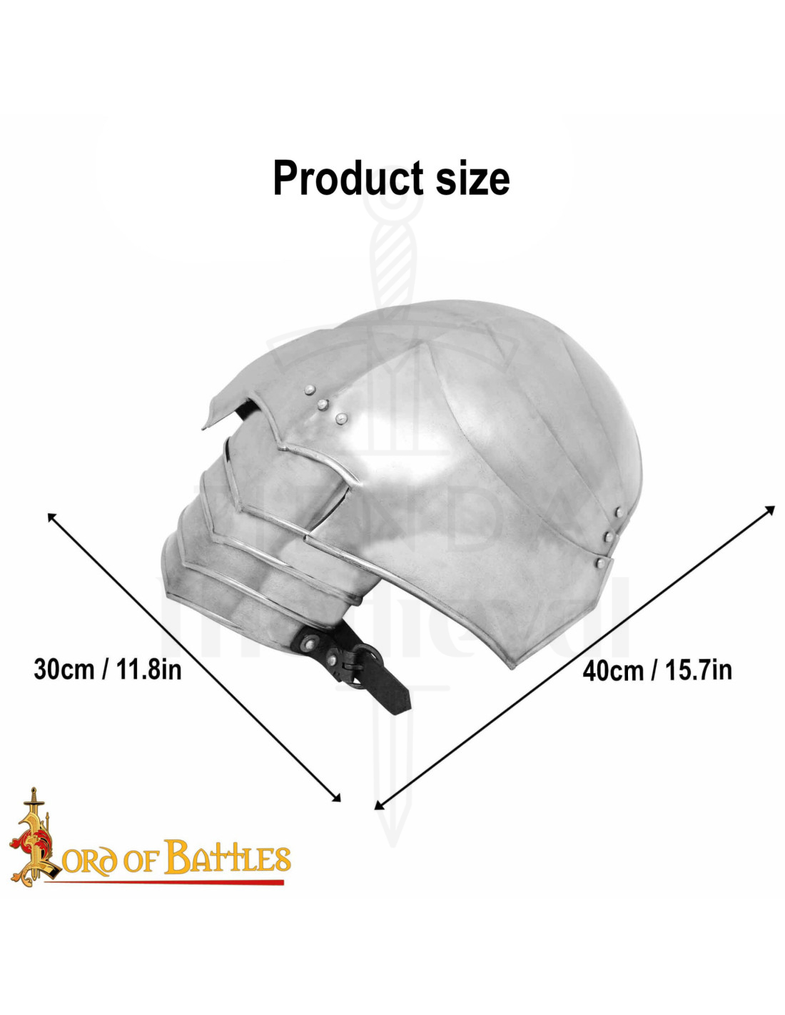 In den Bildern sieht man einen metallischen Helm, der aus beweglichen Platten besteht, mit einer polierten silbernen Oberfläche und funktionalen Details wie Nieten und Scharnieren, Elemente, die die Liebe zum Detail dieses Typs von Stücke widerspiegeln. Dieser gleiche Ansatz in der Herstellung zeigt sich auch in den Schulterschützern, die historische Ästhetik und natürliche Bewegungen kombinieren, ideal zum Posen, für nachgestellte Kämpfe oder zum Vervollständigen eines Ausstellungs-Outfits.