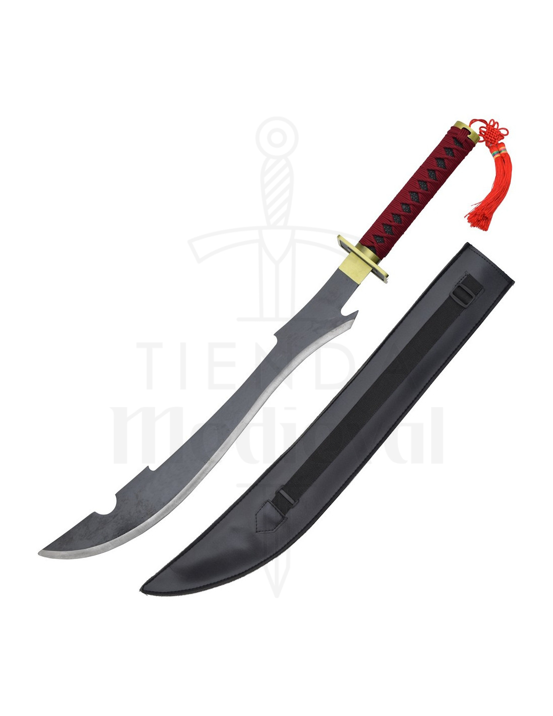 Der Holzgriff, umwickelt mit einem roten Seil im schwarzen Kreuzmuster und mit einem roten Quastenabschluss, reproduziert nicht nur das Aussehen des Originals, sondern bietet auch einen bequemen und visuell beeindruckenden Griff. Der goldfarbene metallische Handschutz fügt Kontrast hinzu und vervollständigt das Ensemble mit einem Hauch von Unterscheidung.