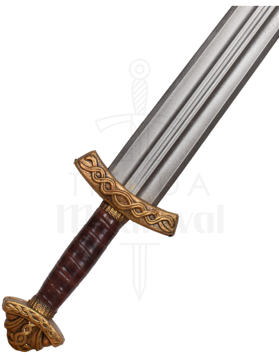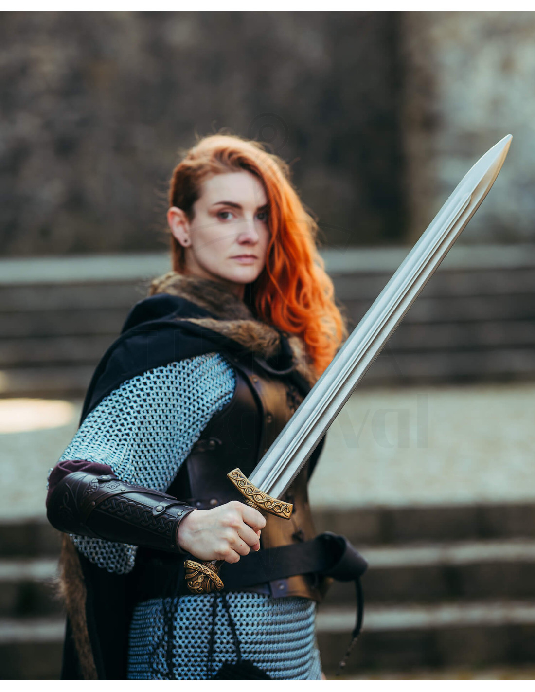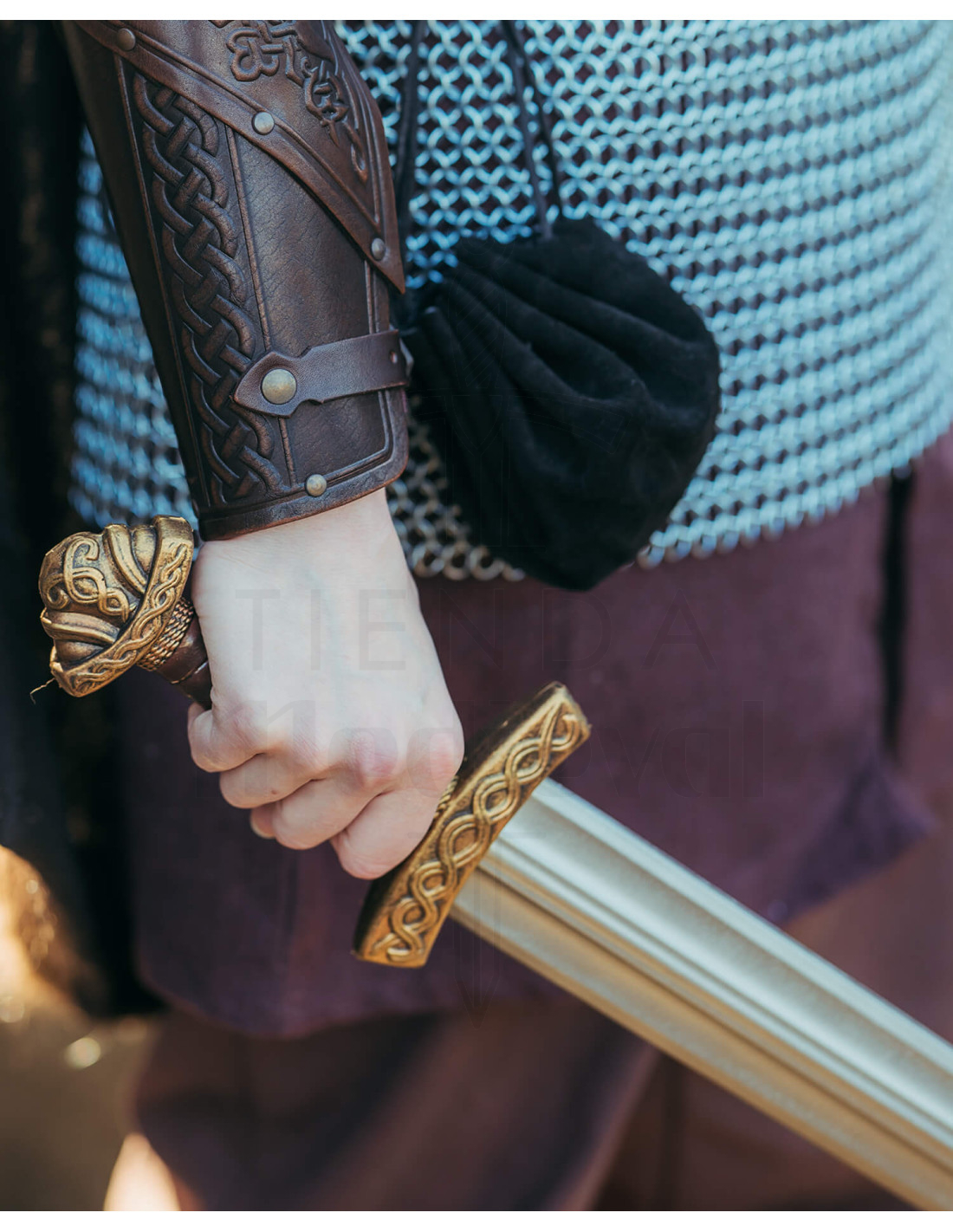 Bist du bereit, der Held deiner Geschichte in der Welt des LARP zu werden? Lass dich von diesem beeindruckenden mittelalterlichen Schwert überraschen, perfekt für Wikinger-, Barbaren- oder Nord-Abenteurer, die in jeder Schlacht authentisch aussehen möchten. Das Design zeigt eine lange, gerade Klinge mit einer metallischen Oberfläche, die das Licht reflektiert, begleitet von einem braunen, texturierten Griff, der einen festen und sicheren Halt garantiert. Der dekorative goldene Parierstange mit Reliefdetails verleiht jedem Kampf eine Note von Eleganz und Originalität, während die spitze Spitze Präzision bei jedem Schlag sichert.