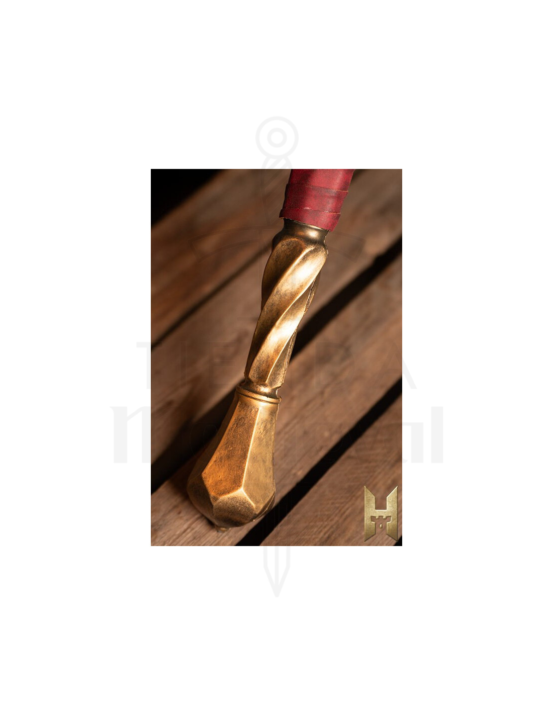 Der Griff, mit Leder bezogen, vereint Komfort und Kontrolle, während die goldene Parierstange und der Knauf, mit aufwändigem und abgerundetem Design, einen dekorativen Akzent setzen, der an Ritter und legendäre Krieger erinnert. Seine ovale Form ermöglicht agile Bewegungen, und die dramatische Ästhetik evoziert ein Erbe treuer und siegreicher Krieger.
