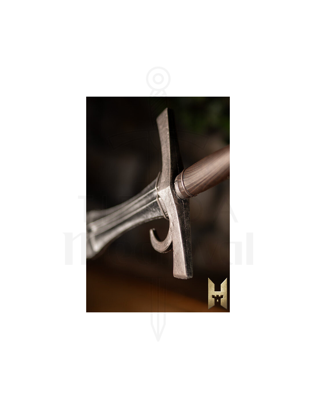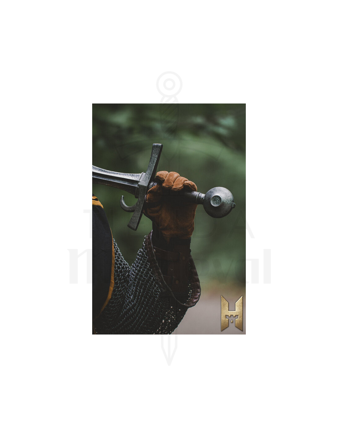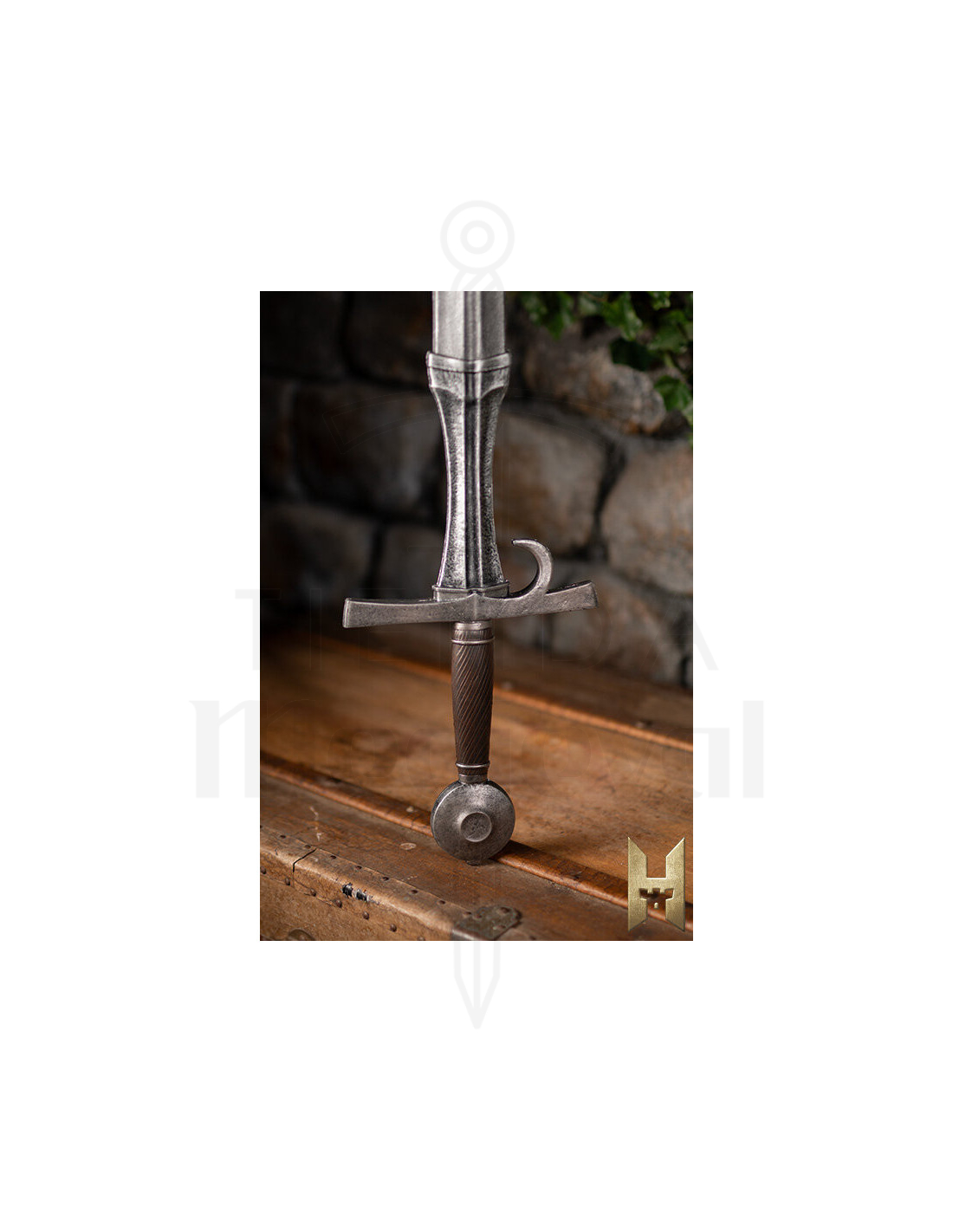 Der geformte Trapezgriff, umwickelt mit Leder, bietet einen bequemen und sicheren Griff, auch bei dynamischen Kämpfen. Der minimale Schutz und der abgerundete Knauf ergänzen ein elegantes und funktionales Design, das Einfachheit und Effizienz bei jeder Bewegung priorisiert. Die glänzende Oberfläche verleiht ihm einen realistischen und attraktiven Look, ideal für Sammler oder Cosplayer, die eine Ausrüstung suchen, die durch ihren authentischen mittelalterlichen Stil hervorsticht.