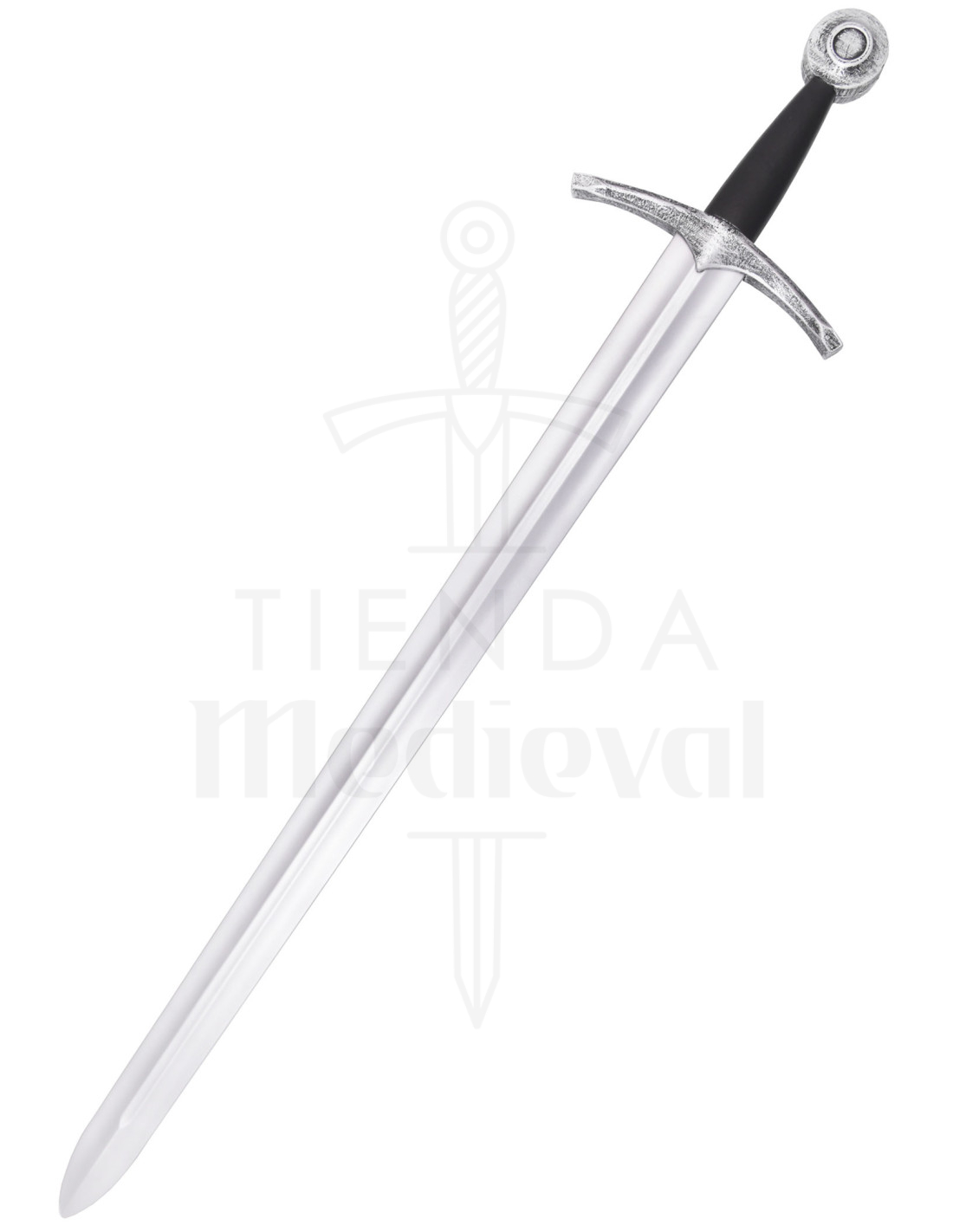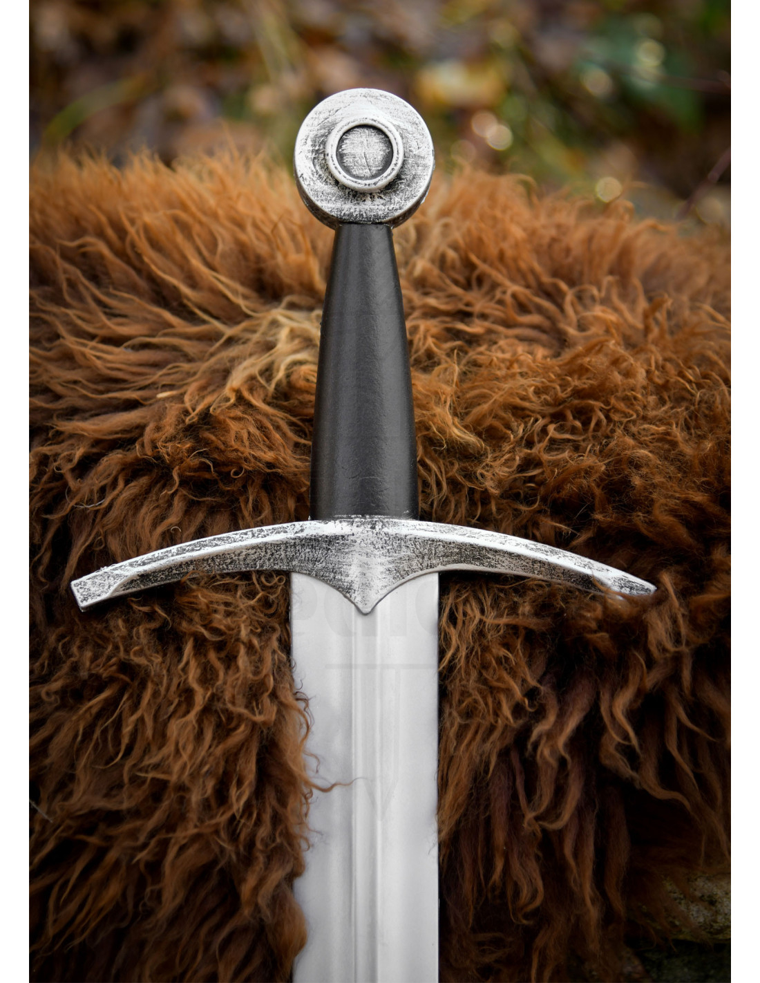 Der schwarze, glatte und komfortable Griff bietet auch nach langen Spiel- oder Aufführungstagen einen sicheren Halt und ermöglicht dir, Haltung und Technik ohne Ablenkungen beizubehalten. Die gealterte Parierstange mit sanften Kurven und der runde Knauf in antik silberner Ausführung veredeln das Gesamtbild mit einem klassischen Flair und verleihen visuelle Authentizität, die mit Rittern, königlichen Wachen und Kriegern des Hochmittelalters harmoniert. Die Kombination aus einfachem Design und historischen Elementen sorgt dafür, dass das Schwert deine Figur begleitet, ohne ihr die Show zu stehlen.