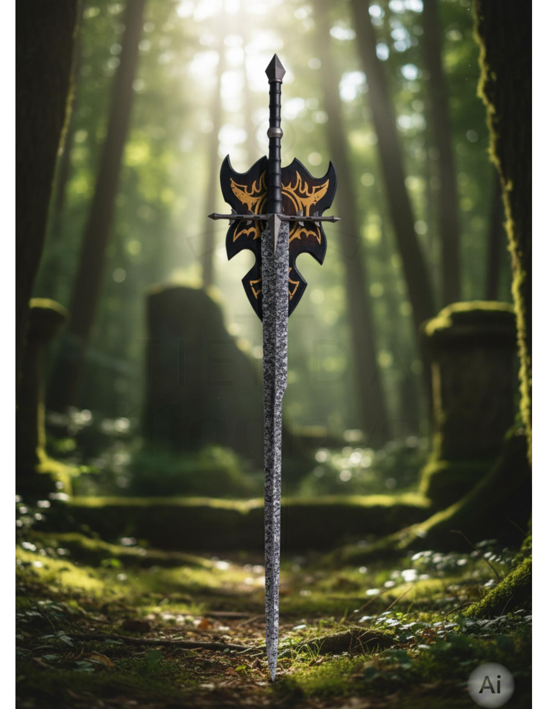 Die Klinge, gefertigt aus Stahl mit gealtertem Finish und abgenutzter Schneide, verbindet Robustheit mit Ästhetik und erzeugt einen antiken Effekt, der Sammler und Fans gleichermaßen begeistern wird. Der Parier und der Knauf aus metallischem Nickel bieten einen eleganten Kontrast, während der schwarze Griff ein robustes Aussehen und einen bequemen Halt garantiert. Dank des enthaltenen Halters kannst du das Schwert an der Wand präsentieren. Mit einem Gewicht von 1600 Gramm ist es stabil, aber dennoch leicht genug für eine visuelle oder zeremonielle Handhabung.