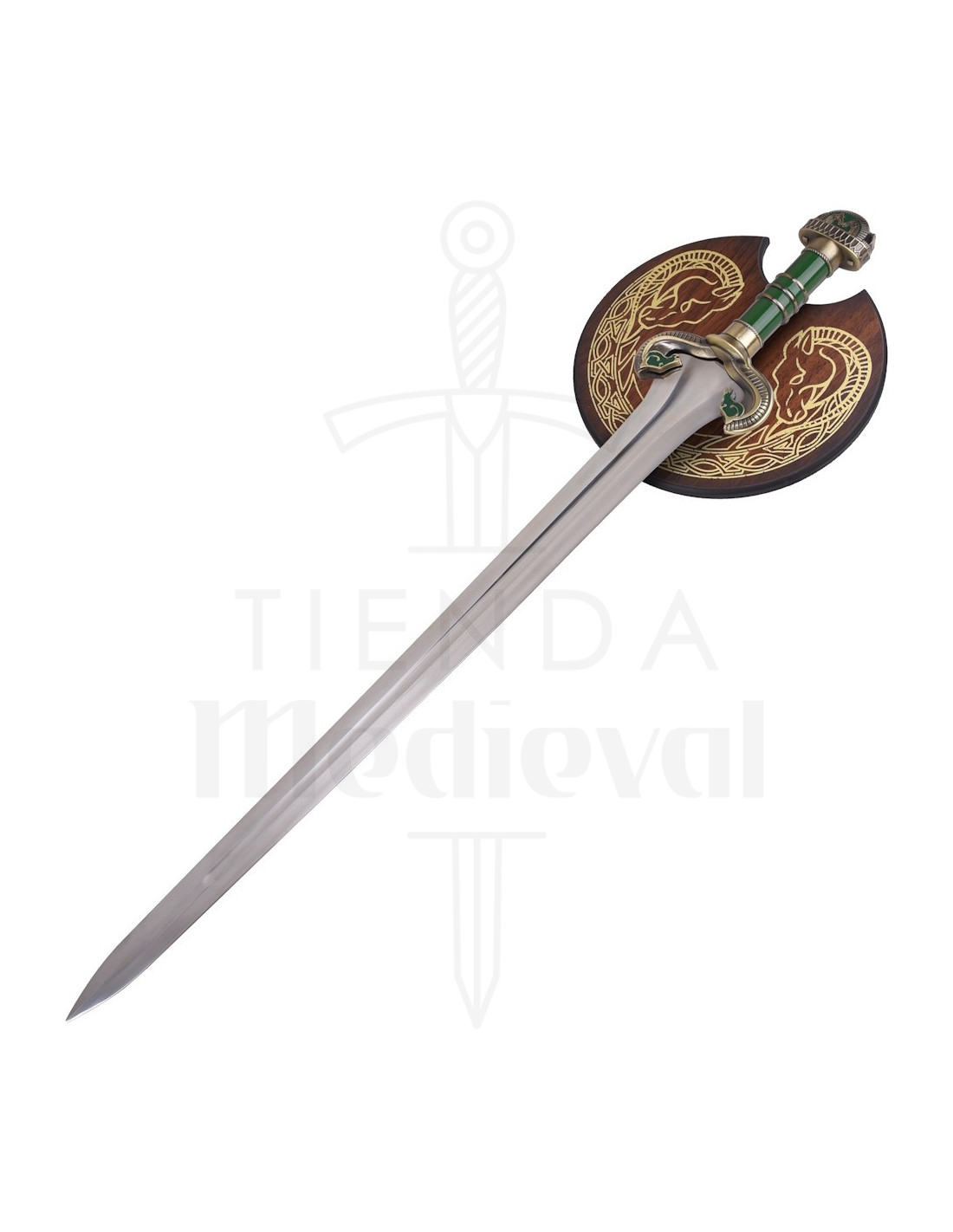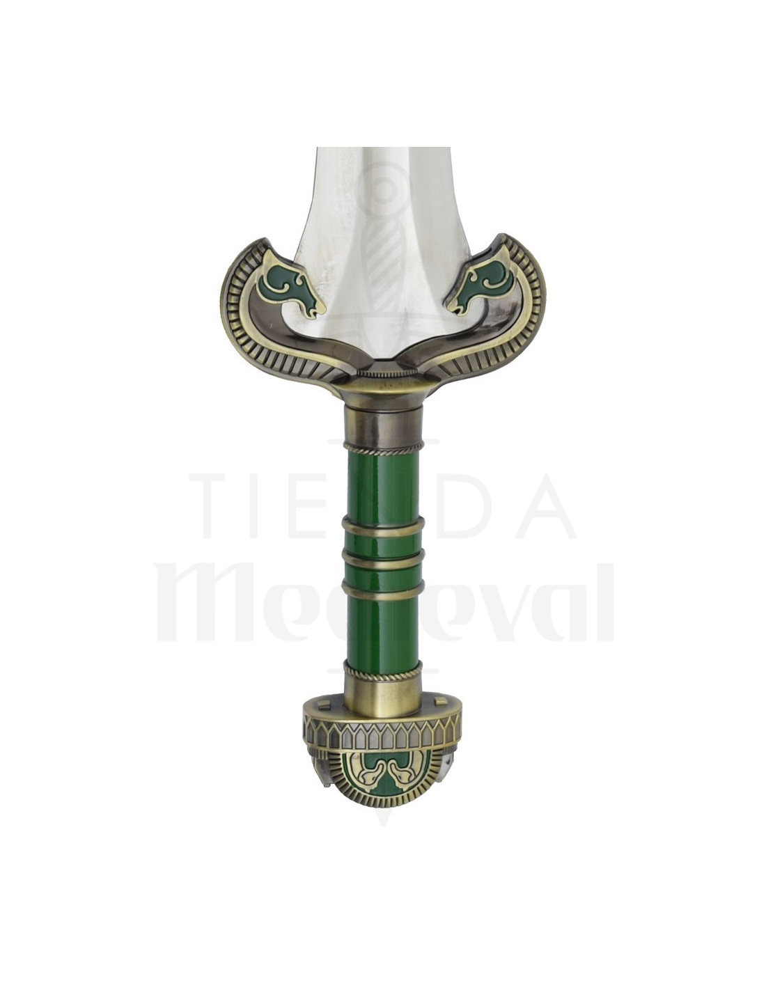 Diese Nachbildung würdigt einen heldenhaften Moment und bietet eine polierte doppelschneidige Klinge, die das Licht mit Charakter reflektiert, sowie eine zentrale Nut, die ihr authentisches Aussehen verstärkt und ein Gefühl von Balance beim Ausstellen vermittelt. Der Grif, in Grüntönen mit goldenen Metallakzenten, bietet einen raffinierten Kontrast, der das Stück zu einem Blickfang macht, während die Parierstange und der runde Knauf, verziert mit stilisierten Motiven, eine sorgfältige Ästhetik vermitteln, die Würde und Entschlossenheit evoziert.