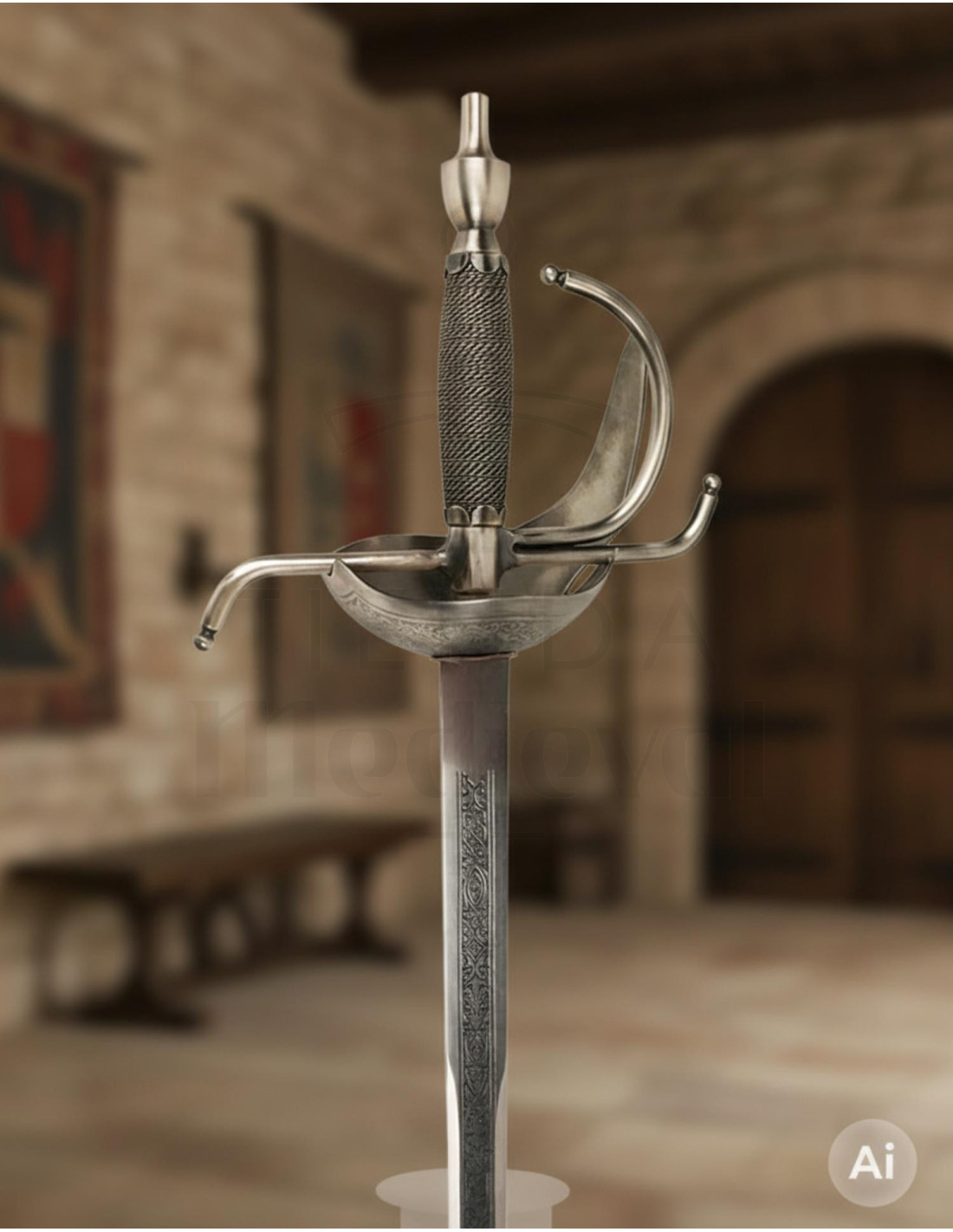 Entdecken Sie die Majestät des Schwertes von König Carlos III! Dieses rustikale Schwert ist ein wahres Kunstwerk mit einer säuregeätzten Edelstahlklinge und einem rustikalen Griff, der Sie in die Zeit der Könige und Ritter entführt.