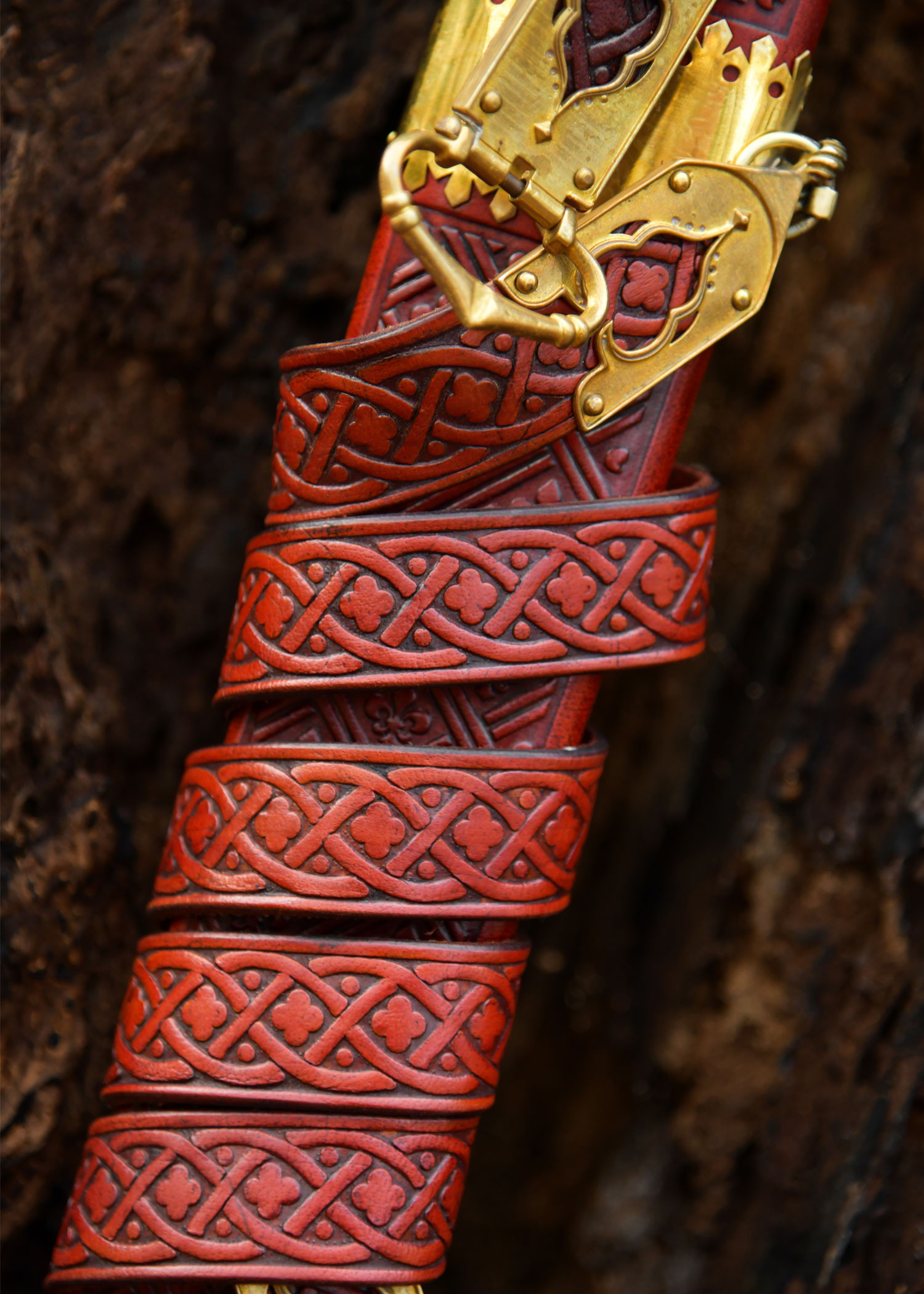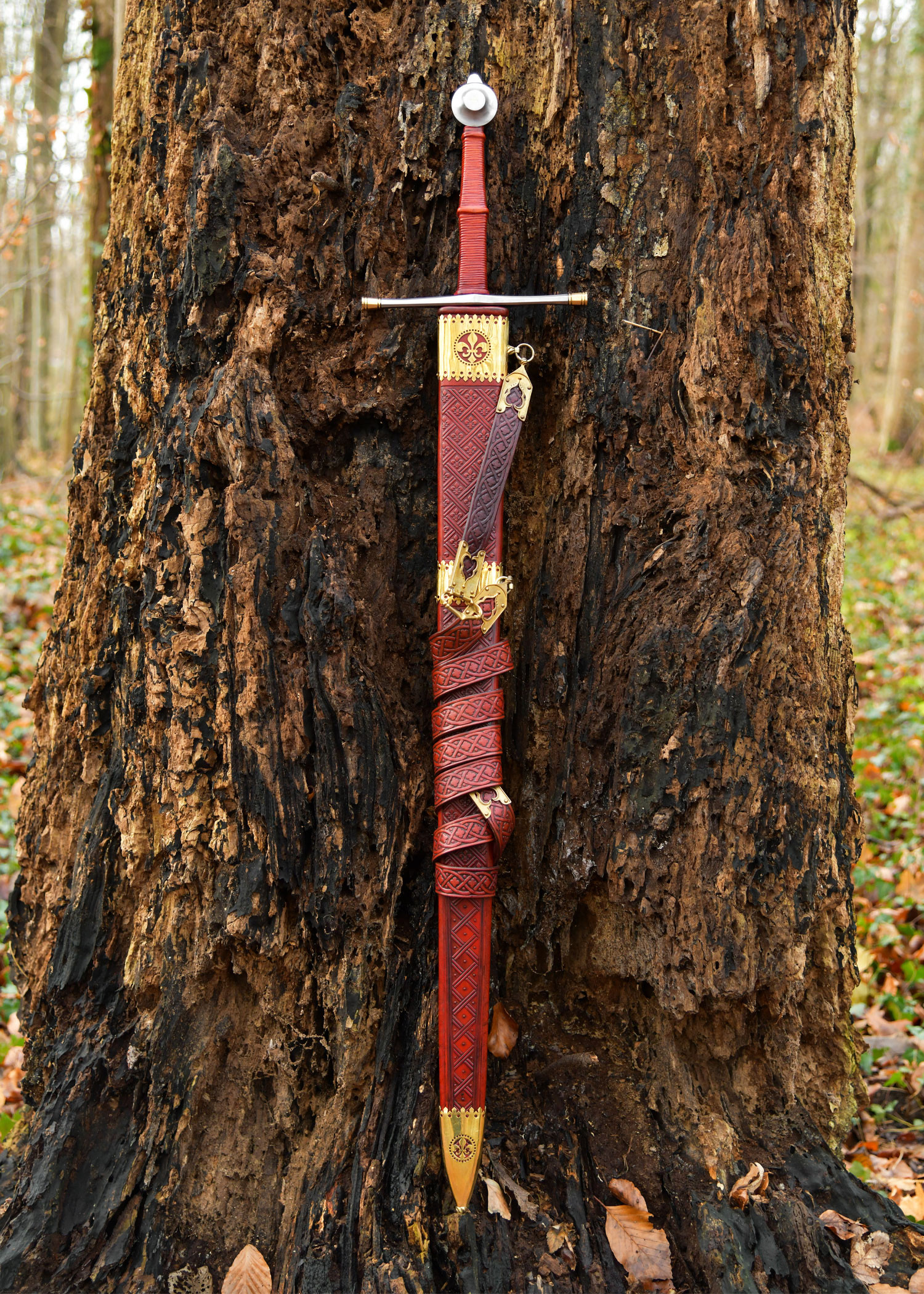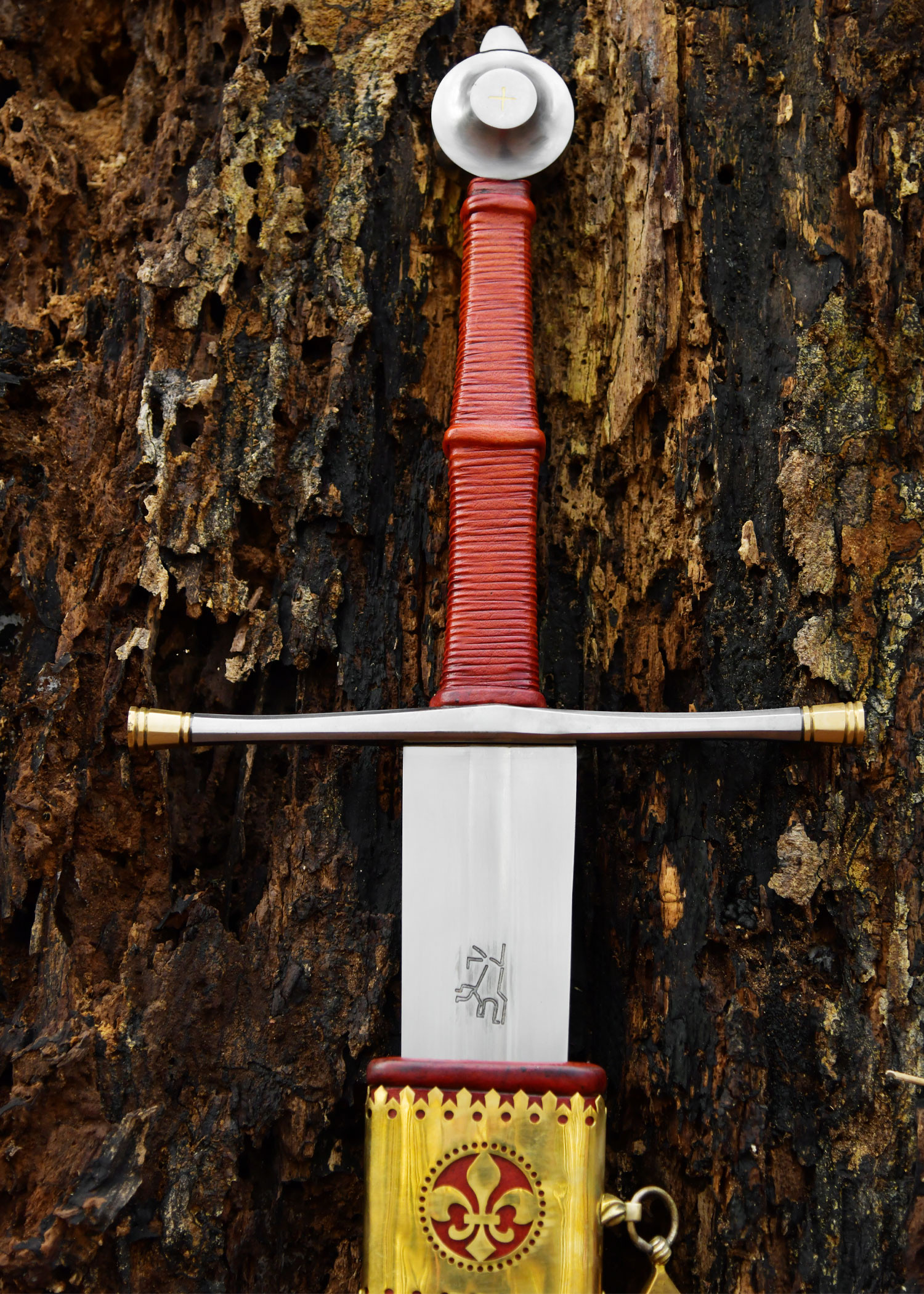 Der mit rötlich-orangefarbenem Leder umwickelte Griff sorgt für einen bequemen und sicheren Halt, ideal um das Schwert natürlich zu präsentieren oder als Zubehör bei Nachstellungen zu verwenden. Die Stahlparierstange und der mit Kreuzmotiven aus Messing verzierte Knauf sorgen für eine visuelle Ausgewogenheit des Stückes, erleichtern die Handhabung und bieten einen Abschluss, der mit seiner spätmittelalterlichen Ästhetik harmoniert. Der Kontrast zwischen der polierten Klinge und dem goldenen Abschluss der Scheide verstärkt sein Erscheinungsbild als ausgesuchte Ausstellung.