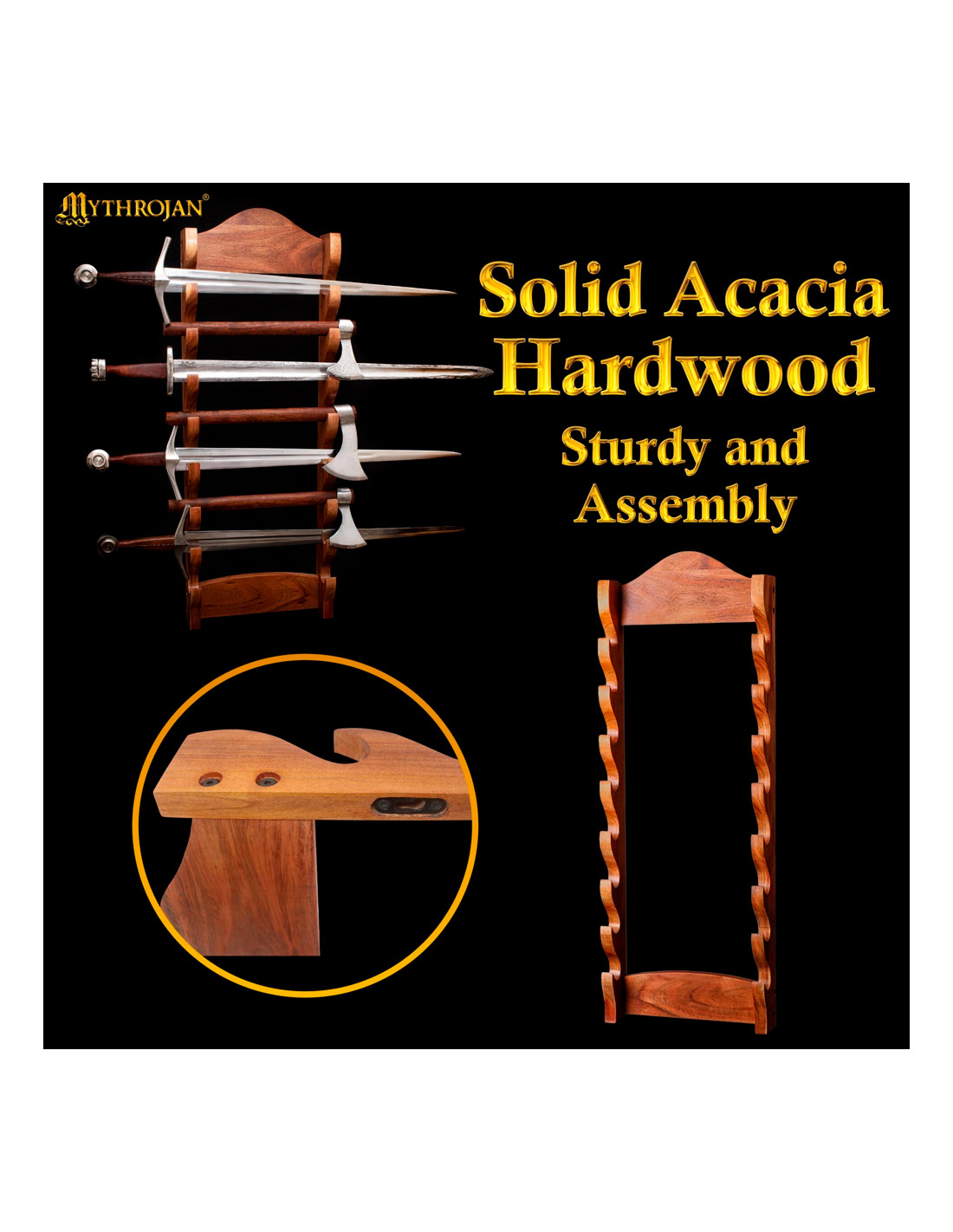 Dieser aus hochwertigem Holz gefertigte Ständer ist robust und langlebig und sorgt dafür, dass Ihre Schwerter an Ort und Stelle bleiben, ohne dass die Gefahr besteht, dass sie umfallen. Dank seines ergonomischen Designs ist die Installation schnell und einfach und die Rückseite der Halterung ist für die einfache Platzierung an der Wand vorbereitet.