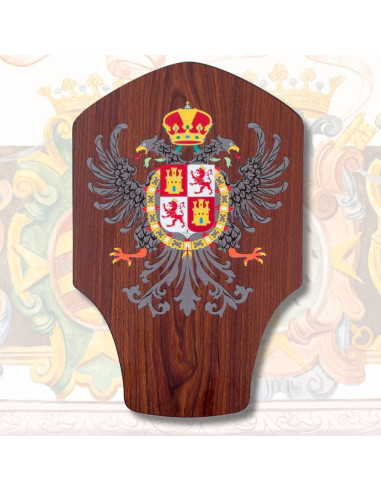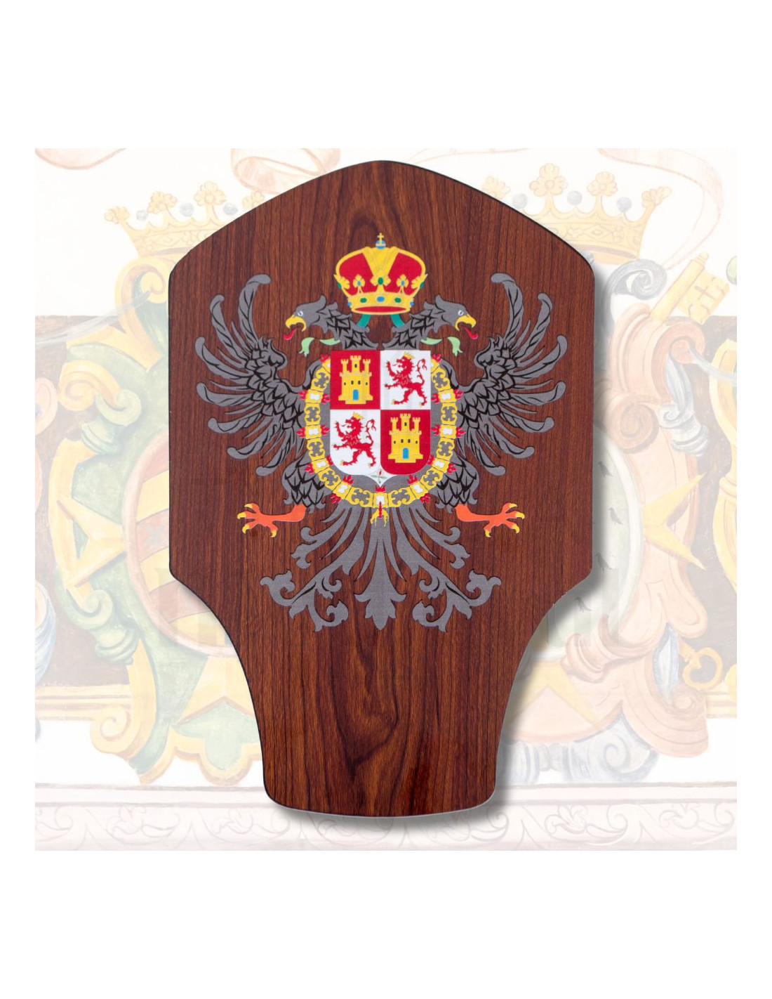 Das zentrale Wappen, inspiriert von den Emblemen von Kastilien und León, präsentiert lebendige Farben wie Rot, Gelb und Grau, zusammen mit ikonischen Details wie Löwen, Burgen und einer Krone, die Adel und Status symbolisiert. Die polierte Oberfläche hebt die Qualität des Holzes hervor und sorgt nicht nur für langfristige Haltbarkeit, sondern auch für einen zeitlosen Stil, der in jede klassische oder historische Umgebung passt.