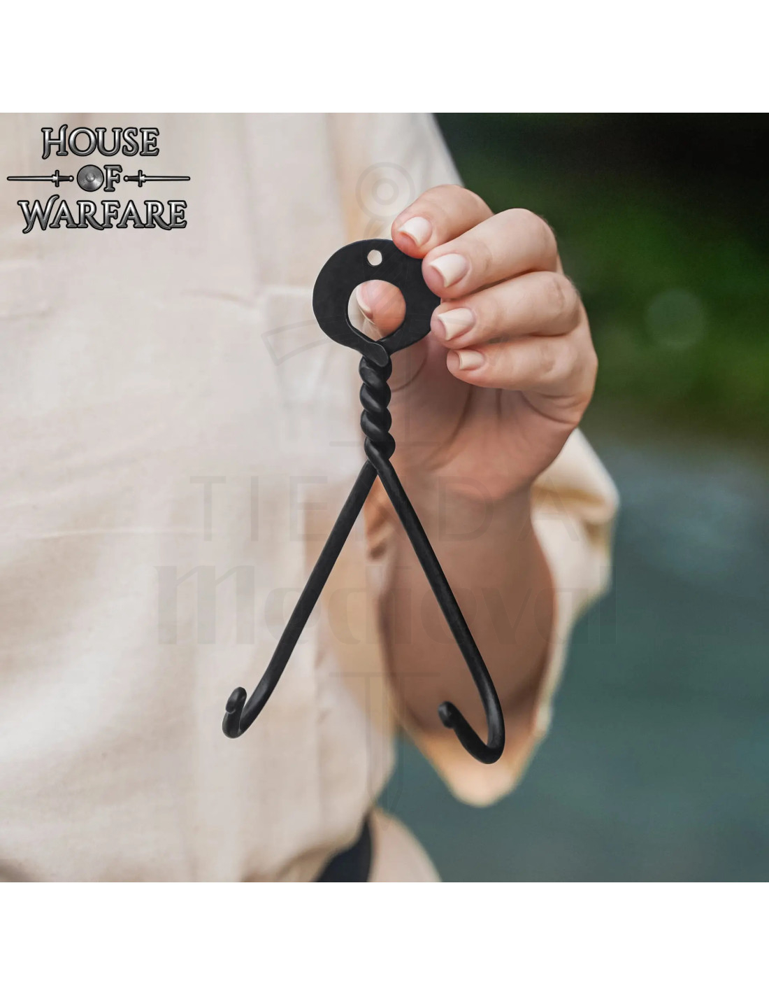 Der gedrehte Hals und das doppelte Haken-Design sind nicht nur dekorativ, sondern auch darauf ausgelegt, den Griff sicher zu halten und unerwartete Bewegungen zu vermeiden. Die nach innen gebogenen Spitzen bieten zusätzlichen Halt, sodass das Schwert stabil bleibt, egal ob es senkrecht oder leicht geneigt platziert ist, was den Zugriff und die Sicht erleichtert.