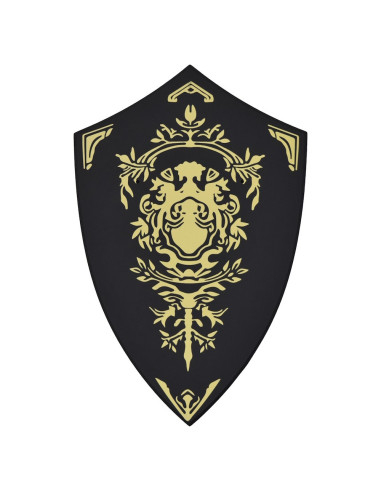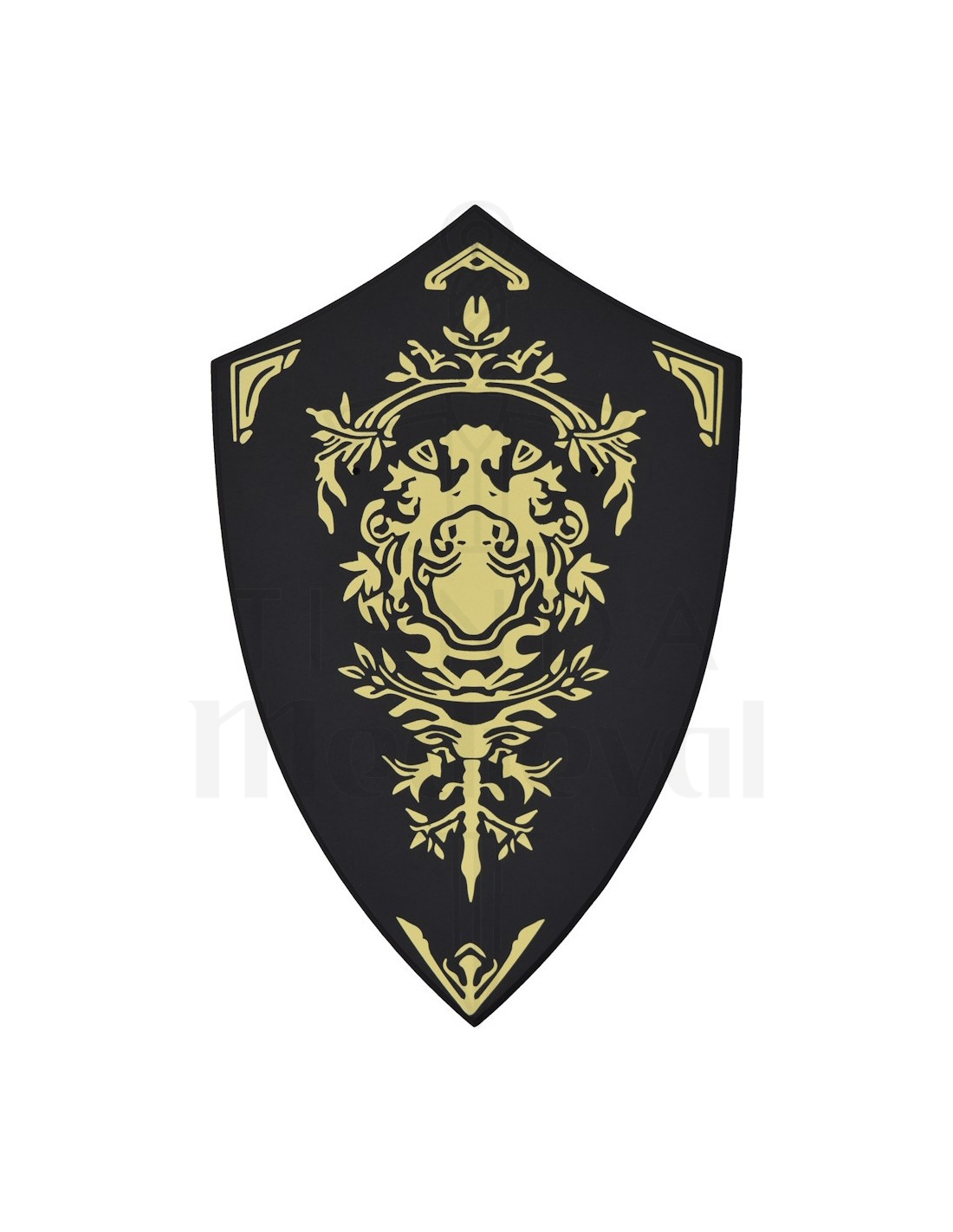 Das dekorative Schild, das das Set ergänzt, fügt einen eleganten Fokus hinzu: seine schwarze Basis kontrastiert mit einem zentralen Motiv und goldenen Kanten, mit einem symmetrischen Design, das an florale und heraldische Motive erinnert und dazu gedacht ist, den epischen Charakter des ausgestellten Stücks zu ergänzen. Dieser Kontrast verleiht Tiefe und ein formelles Aussehen, ideal für die Präsentation in Salons, Büros oder Themenräumen.