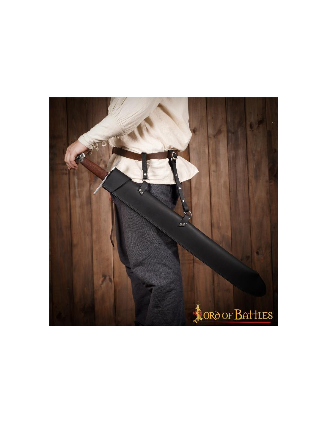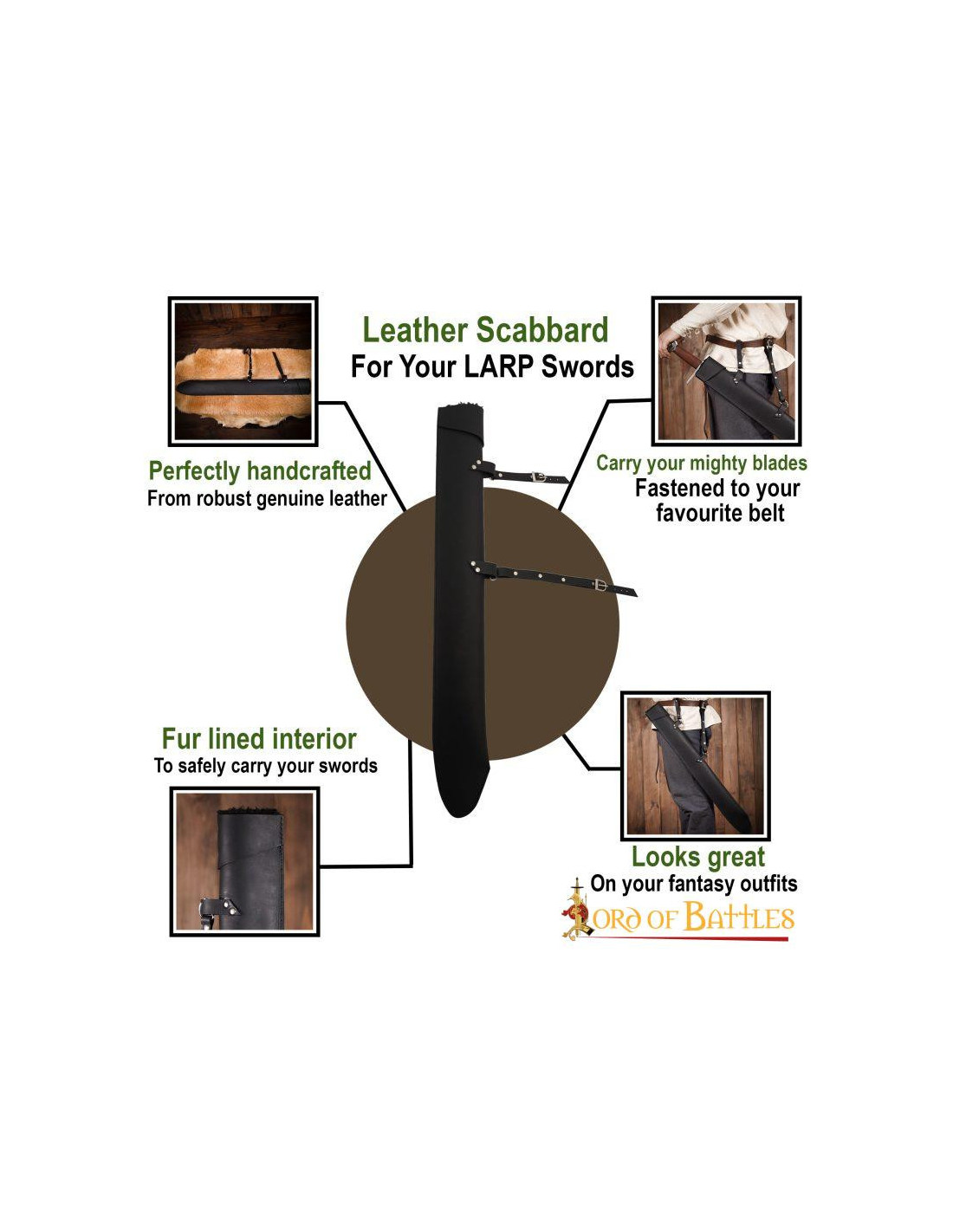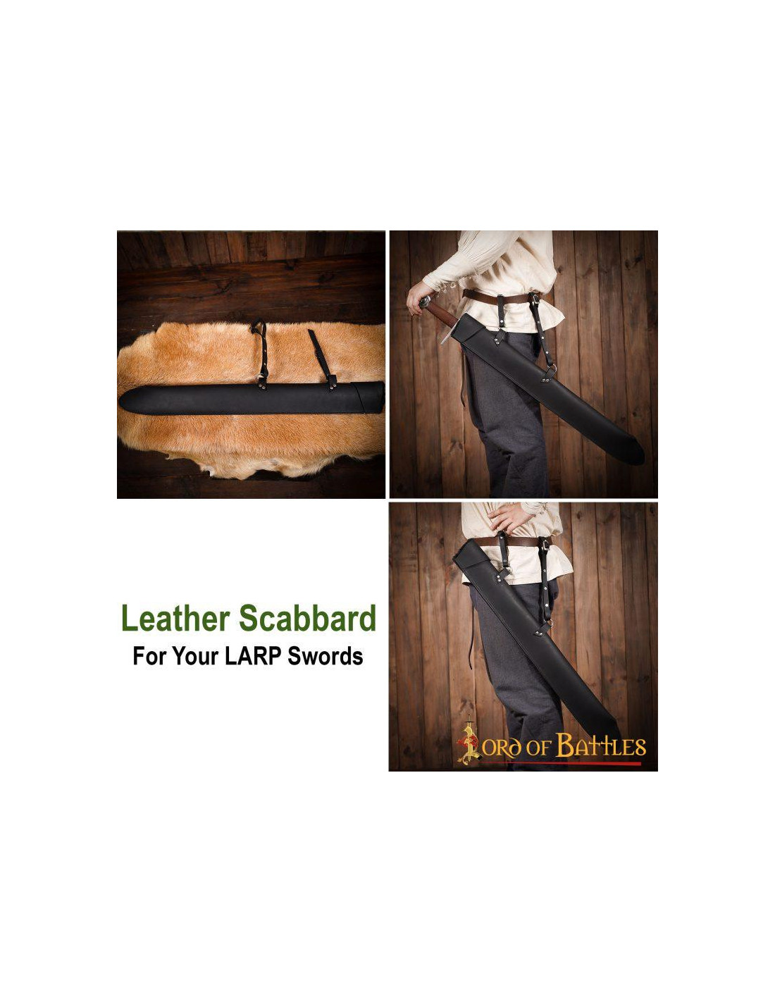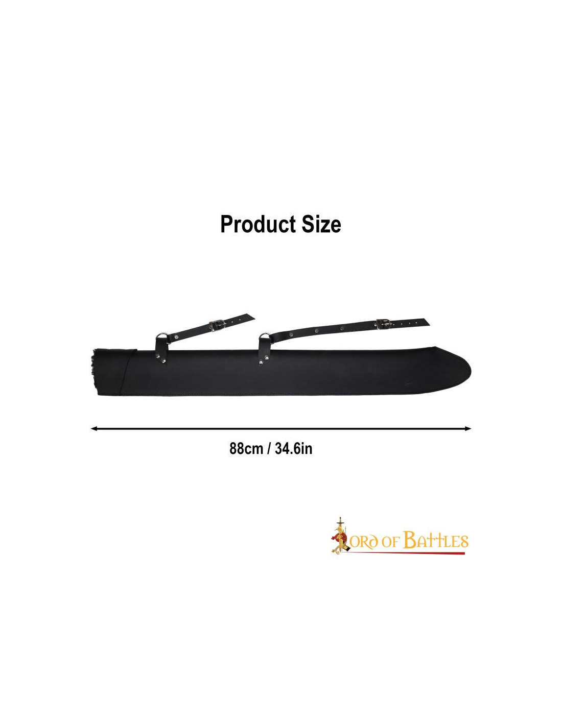 Handgefertigte Lederscheide für LARP-Schwerter, 87 cm. Schützen und verschönern Sie den Stil Ihres Lieblingsschwerts mit unserer tollen Lederscheide! Das Besondere und Einzigartige an unserer Lederscheide ist, dass sie aus hochwertigem Echtleder mit einer Dicke von 3,0–3,3 mm handgefertigt ist. Sein Design wurde sorgfältig trommelgefärbt, wodurch jedes Stück eine satte Farbmischung mit dem Leder und ein elegantes mattschwarzes Finish erhält.