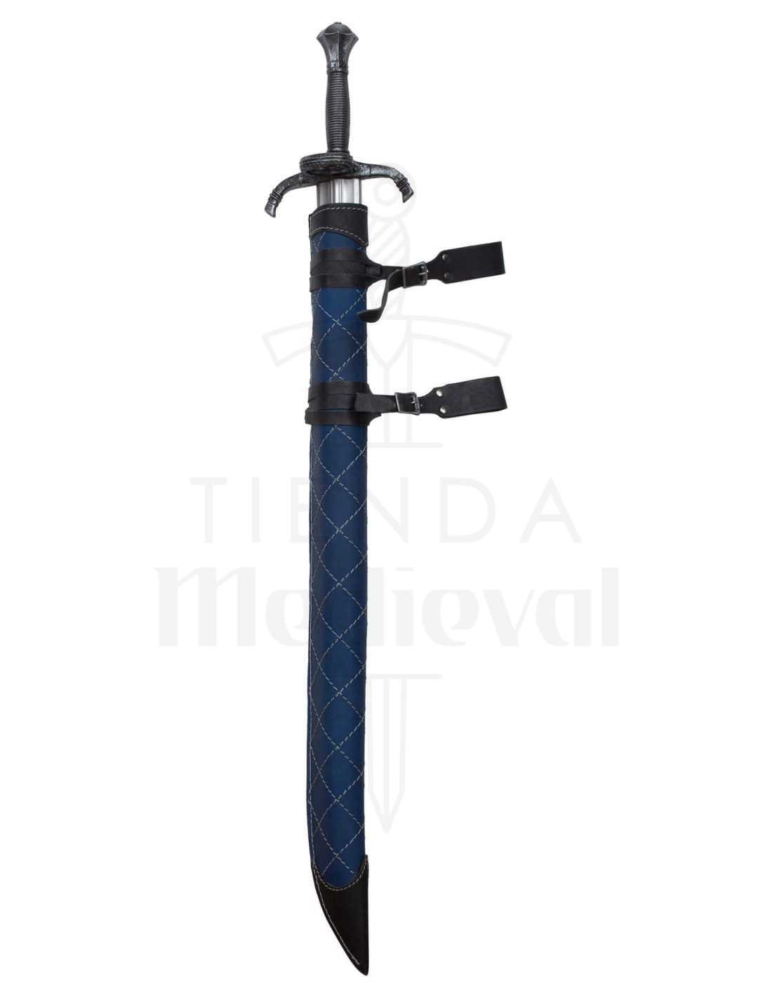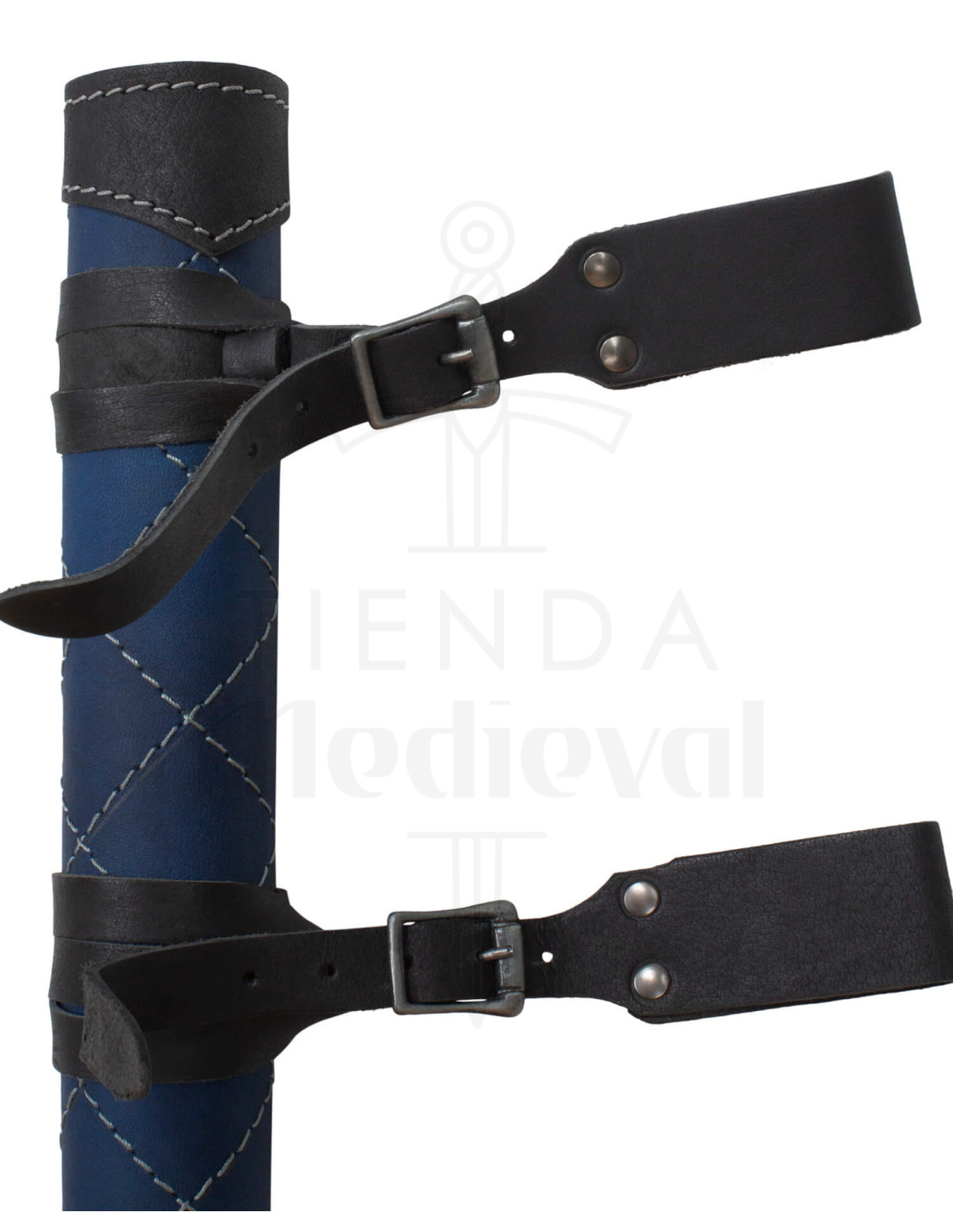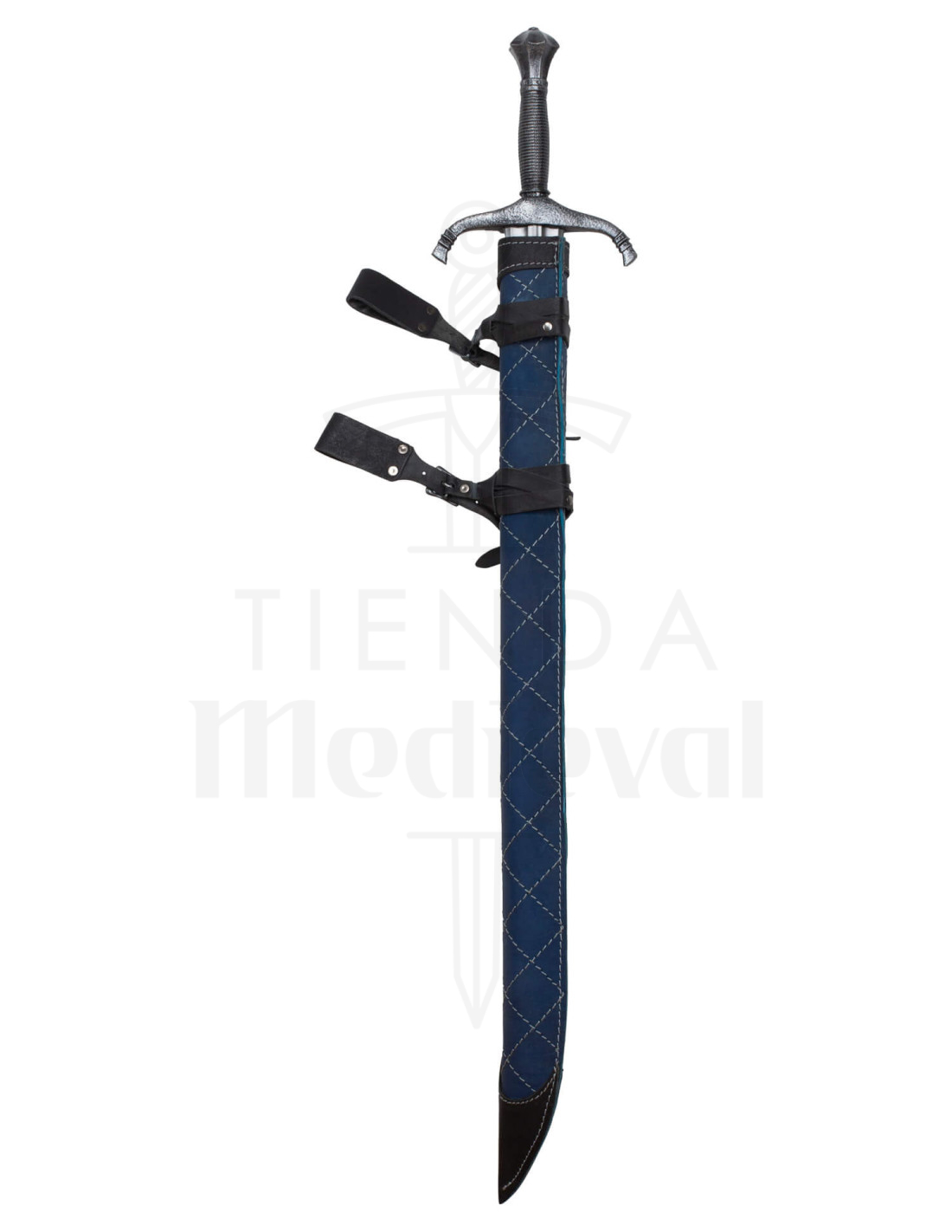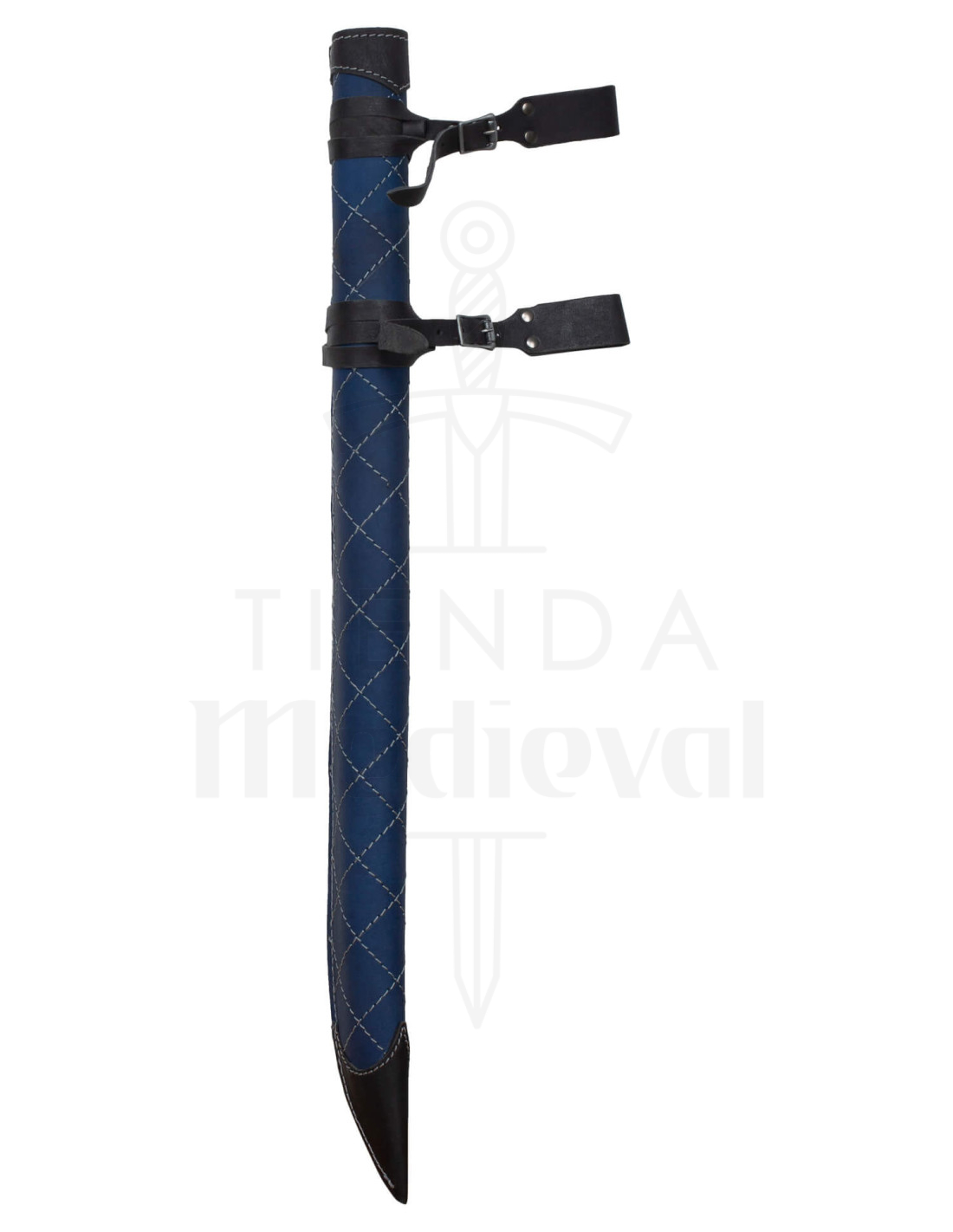 Das hochwertige, handgefertigte Naturleder bietet nicht nur Robustheit und Langlebigkeit, sondern entwickelt mit der Zeit auch eine schöne Patina, wodurch jede Scheide einzigartig wird. Die strukturierte Textur und die schwarzen Details am unteren Ende sorgen für einen attraktiven visuellen Kontrast, während die Größe Platz für Schwerter bis zu 86,5 cm Länge und einer Klingenbreite von bis zu 6 cm bietet — wie unsere robusten Longswords Hammerkunst.