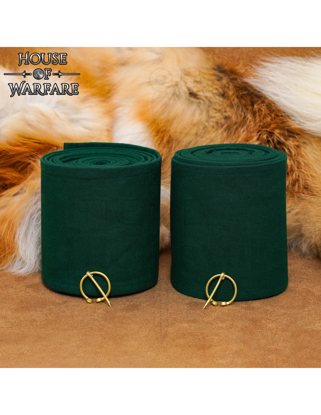 Hergestellt aus einem dunklen grünen, groben Stoff mit sichtbarer Textur, werden die Winingas eingerollt und teilweise abgerollt präsentiert, damit du sowohl die Breite als auch die Qualität des Materials schätzen kannst. Wenn du sie anlegst, wirst du spüren, wie sie das Wadenbein umschließen, Halt und Schutz bieten, ohne die Atmungsaktivität einzuschränken. Die Bronzenadeln mit kreisförmigem Design und zentralem Stift fixieren sicher und halten alles während langer Reenactment-Tage oder Veranstaltungen an seinem Platz.