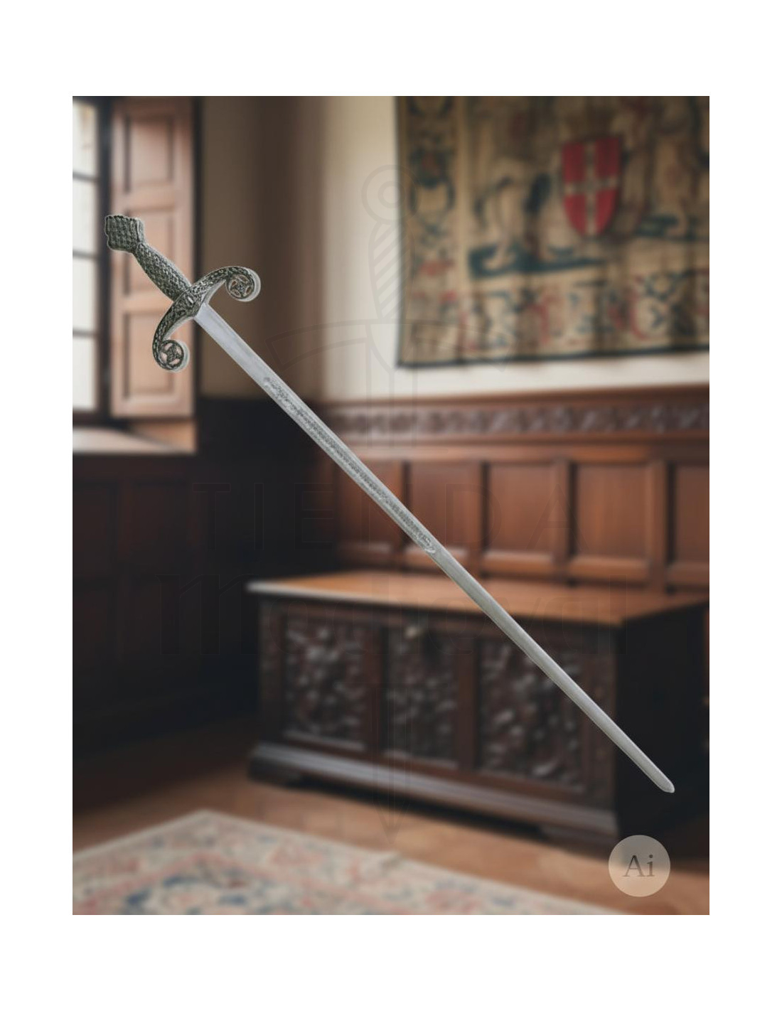 Entdecken Sie die Majestät des Schwertes Fernando III! Mit einem rustikalen Finish, das ihm ein authentisches und mittelalterliches Aussehen verleiht, ist dieses Schwert perfekt für Mittelalterliebhaber. Seine Zamakplatte mit den Maßen 106 x 17 cm garantiert Widerstandsfähigkeit und Haltbarkeit.