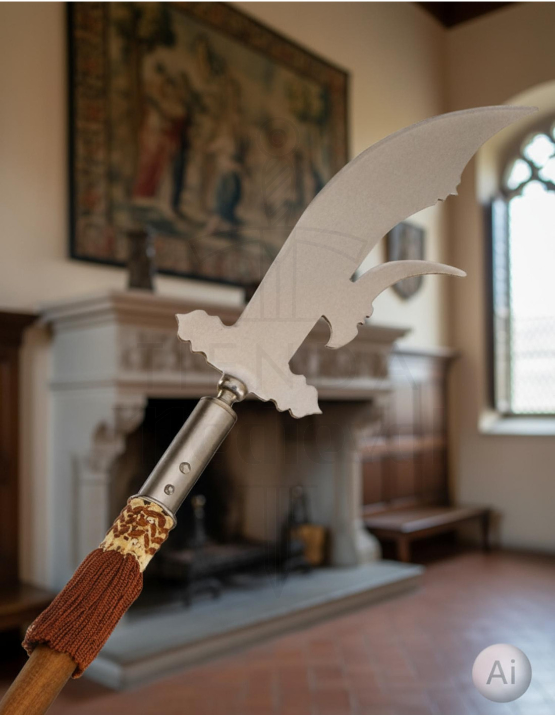 Diese imposante Guisarma, deren Variante bisarma in der europäischen Militärnutzung verbreitet war, verbindet die Robustheit einer Stangenwaffe mit der Funktionalität einer scharfen Klinge, die ursprünglich zum Haken und Schneiden entwickelt wurde.
