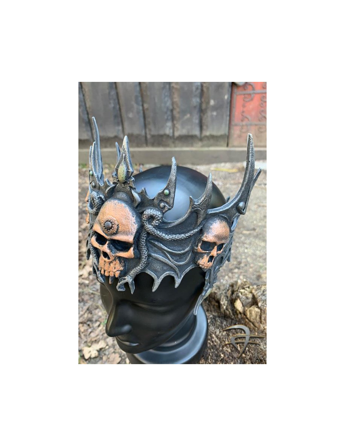 Grünliche Edelsteindetails und schlangeninspirierte Ornamente verleihen diesem Stirnband einen Hauch von Eleganz und Raffinesse. Darüber hinaus ist die Vorderseite mit drei bronzefarbenen Totenköpfen verziert, die ihm einen köstlich düsteren und bösen Ausdruck verleihen.
