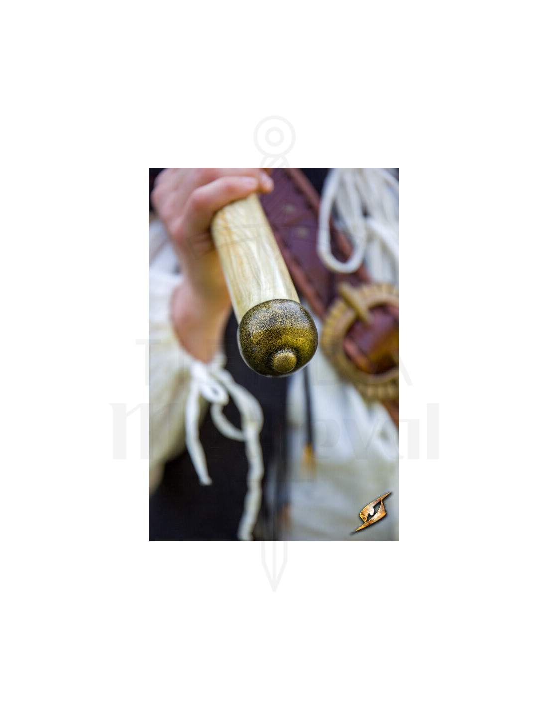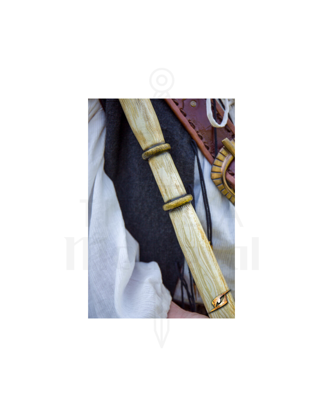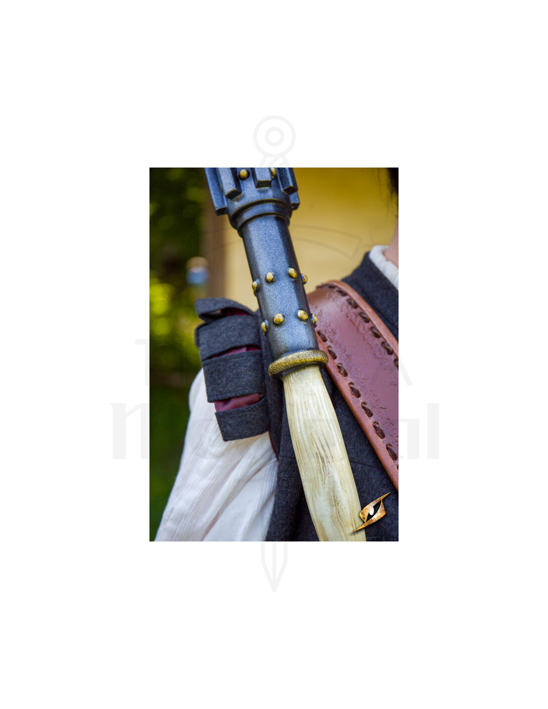 Der von Eschenholz inspirierte Griff ist mit Bändern verziert, die den Glanz von goldenem Stahl simulieren und nicht nur eine luxuriöse Ästhetik, sondern auch einen festen und bequemen Griff für lange Kampftage bieten. Dank seiner Leichtigkeit und Ausgewogenheit ist es leicht zu handhaben und ermöglicht Ihnen eine agile Bewegung, während Sie die ganze Kraft einer stumpfen Waffe in Ihren Händen behalten.