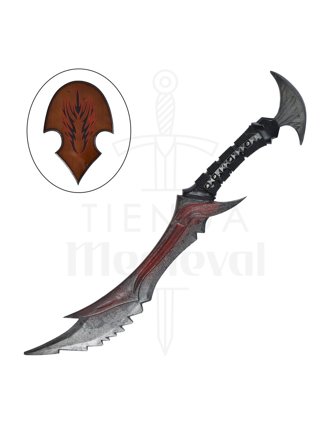 Das Design der Klinge spiegelt klar den kantigen und aggressiven Stil der Daedra wider, mit einer doppelseitigen Schneide und roten Details in der Mitte, die Macht und Größe hervorrufen. Hergestellt aus Metall, mit Oberflächen, die Abnutzung und Alterung simulieren, wird dieses Stück zu einem attraktiven Blickfang für jede Sammlung. Der Griff, umwickelt mit schwarzem Material, sorgt nicht nur für einen guten Halt, sondern verleiht auch mit seinen eleganten metallischen Details einen imposanten Touch.