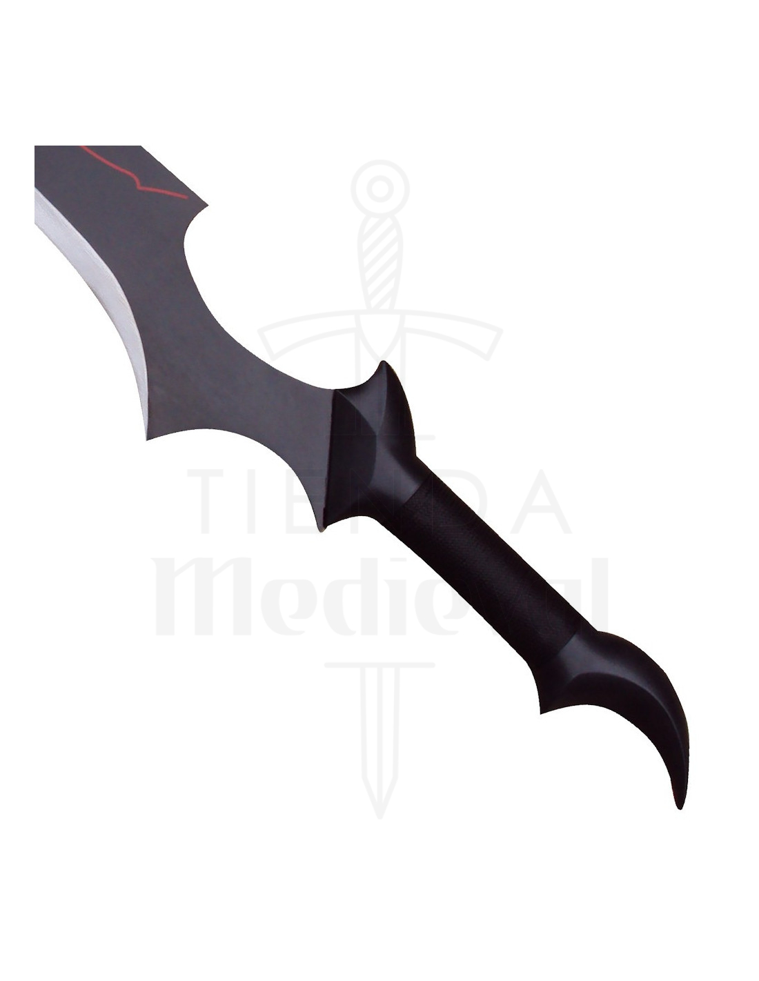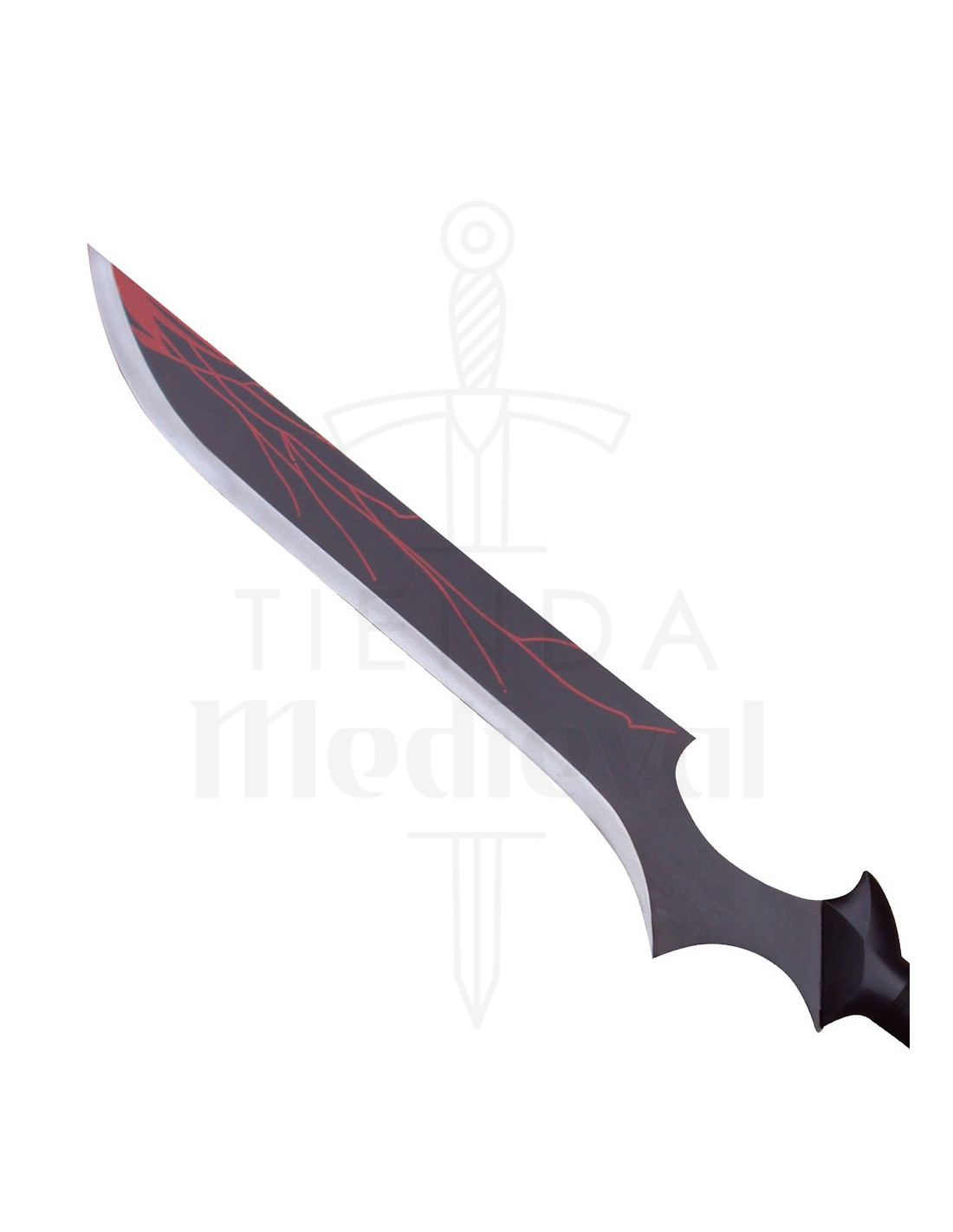 Hergestellt aus hochwertigem Stahl, weist die Klinge ein schwarzes Finish mit roten Mustern auf, die einen mysteriösen und auffälligen Stil hervorrufen – ideal, um eine fantasievolle Atmosphäre zu schaffen. Der ergonomische Griff, schwarz mit rutschfester Textur, ermöglicht einen bequemen und sicheren Halt. Die Scheide, ebenfalls in Schwarz und aus synthetischem Material, verfügt über einen Verschlussriemen, der den Transport und die Präsentation erleichtert.