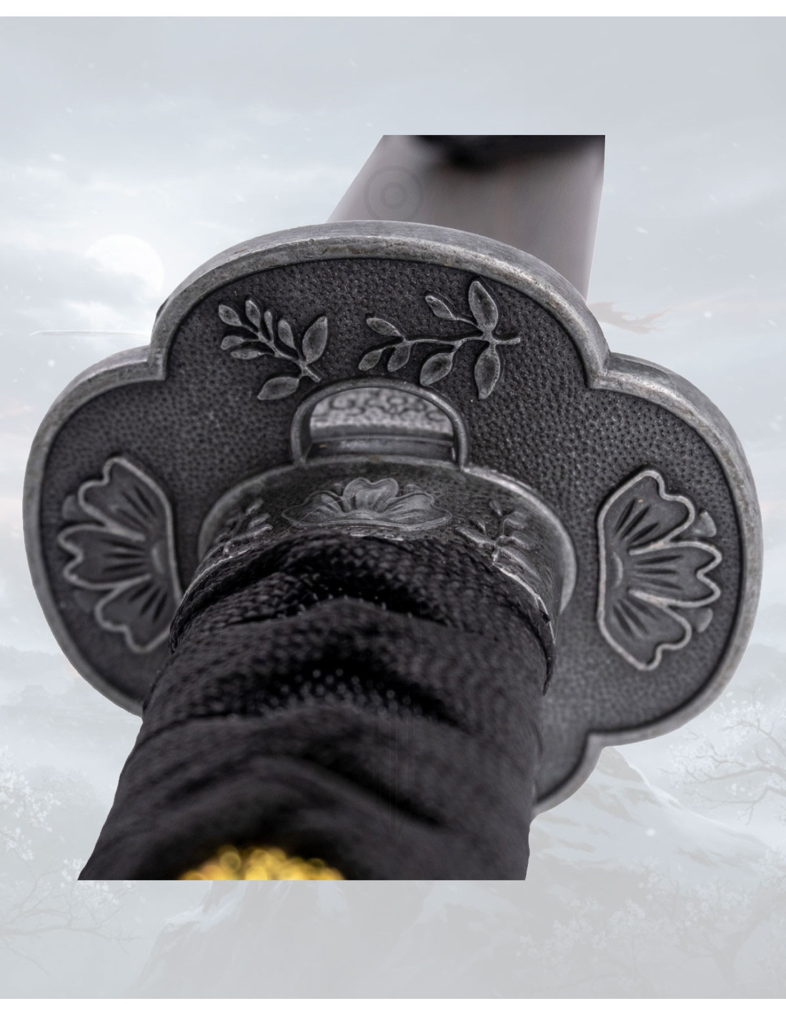 Der Griff, der in ein schwarzes gewebtes Material eingewickelt ist, garantiert einen sicheren und komfortablen Halt, der darauf ausgelegt ist, sie beim Umgang geschmeidig zu manövrieren. Die goldenen Symbole auf dem Griff verleihen einen Hauch von Unterscheidung, schaffen einen Kontrast und Charakter, ohne die Schlichtheit des Gesamtbildes zu verlieren. Die dunkle Guard, mit erhabenen Gravuren und einfachem Design, rahmt das Stück dezent und charaktervoll ein.