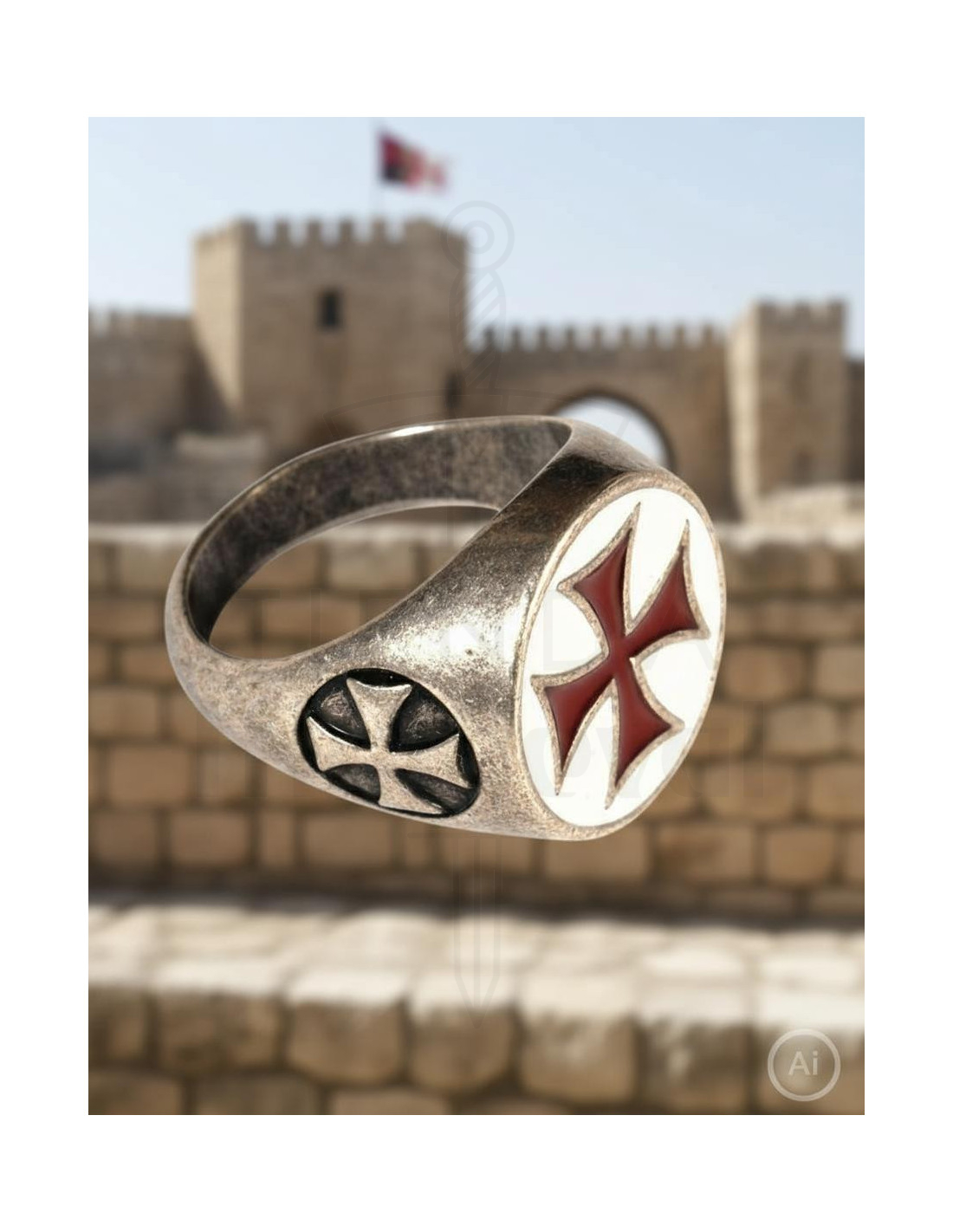 Eines der bemerkenswertesten Merkmale dieses Rings ist sein emailliertes Templerkreuz-Design, das ihm eine unverwechselbare und symbolische Note verleiht. Das Templerkreuz, Symbol der Tempelritter, steht für Tapferkeit, Loyalität und göttlichen Schutz.