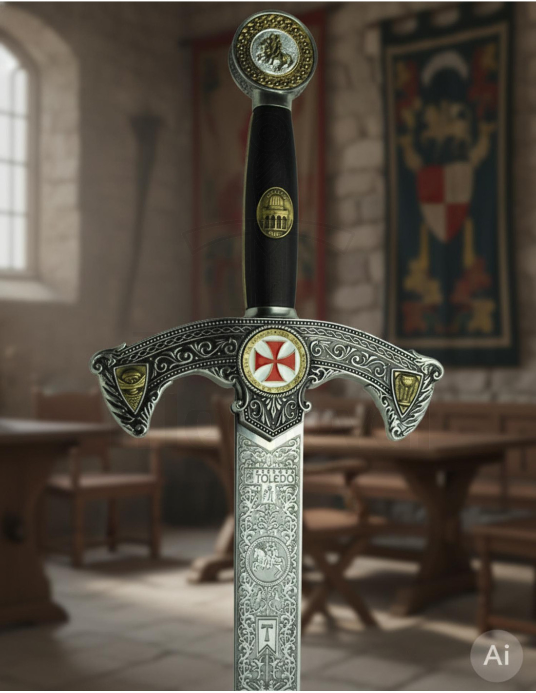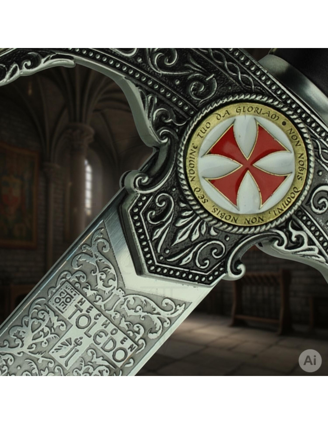 Entdecken Sie das verzierte Templerschwert, ein wahres Juwel für Liebhaber der Geschichte und mittelalterlichen Kultur! Dieses vom renommierten Schwertschmied José Luis Rubio vollständig in Toledo (Spanien) gefertigte Schwert ist ein wahres Kunstwerk.