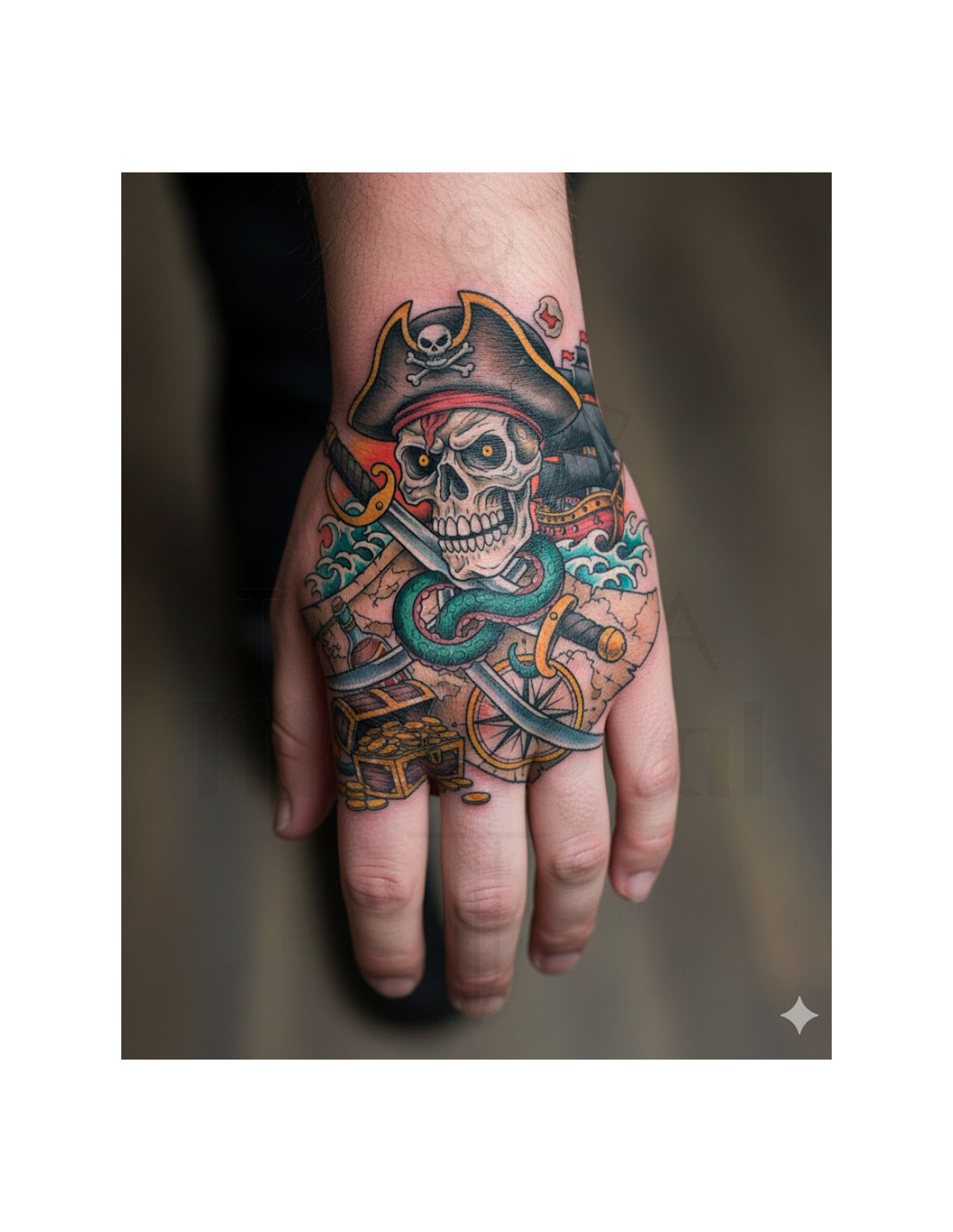 Inspiriert vom Piratenuniversum, voller Farben und auffälliger Details, versetzt dich dieses Tattoo in Meere voller Abenteuer ohne Dauerhaftigkeit. Ob für eine Party, ein Themen-Event oder einfach, um etwas Originelles zu zeigen – der Kauf dieses temporären Tattoos garantiert Qualität, Langlebigkeit und Spaß. Wag dich, stilvoll zu navigieren, ohne deine Haut zu gefährden!