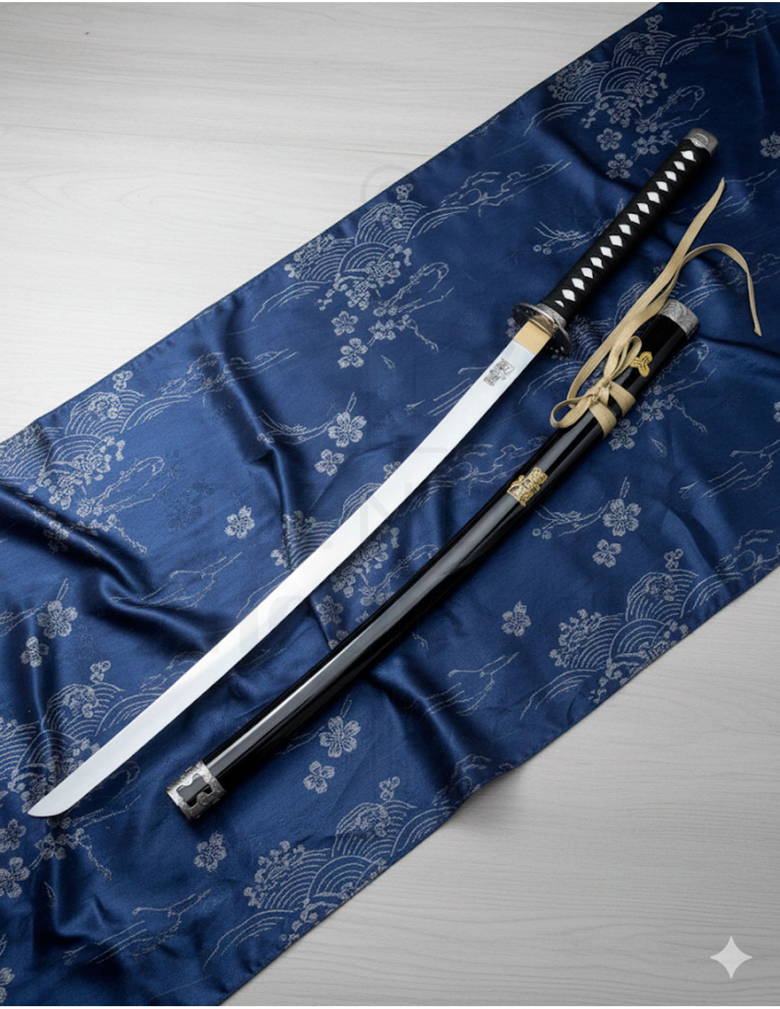 Sein silbernes, poliertes Blatt spiegelt die Raffinesse und den Charakter des ikonischen Hattori Hanzo-Katanas wider, während das Design mit einer Bambusschale und beige Details ein authentisches und elegantes Aussehen verleiht. Der schwarze Griff, umwickelt mit Stoff und Flechtmuster, sorgt für einen sicheren Halt und einen visuellen Hingucker. Die silberne, offene Tsuba setzt einen dekorativen Akzent und unterstreicht die Liebe zum Detail.