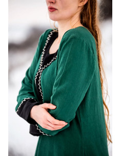 Das zweifarbige Design verbindet Baumwolle perfekt mit detaillierter Handstickerei und schafft so ein einzigartiges Stück, das die Essenz der Wikingermode mit einem modernen Touch einfängt. Jedes Detail dieses Kleides wurde sorgfältig ausgearbeitet, um Ihnen einen zeitlosen und unverwechselbaren Look zu bieten, der nicht unbemerkt bleibt.