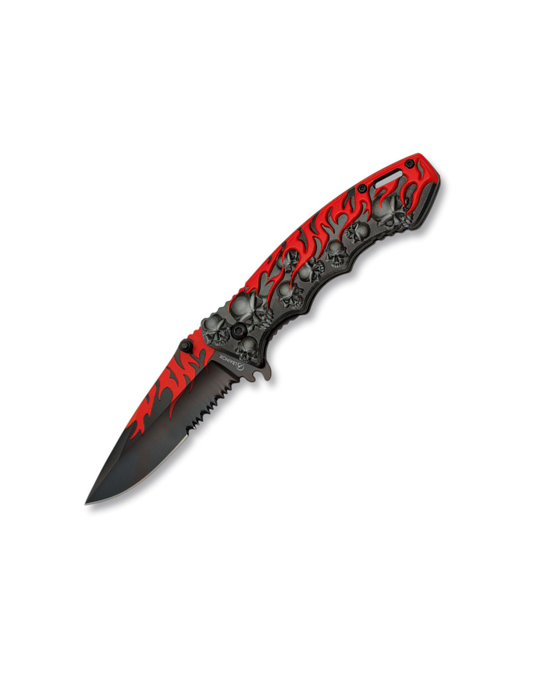 Der Griff des rot-schwarzen Messers Skull & Flames besteht aus Aluminium, was ihm eine außergewöhnliche Haltbarkeit und ein leichtes Gefühl in der Hand verleiht. Darüber hinaus verfügt es über ein Liner-Lock-Verriegelungssystem, das die Sicherheit bei der Nutzung garantiert und unnötige Unfälle verhindert.
