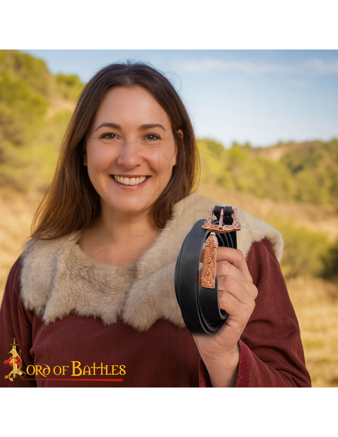 Inspiriert von tatsächlichen Funden aus Nordeuropa, ruft diese Schließe die Ästhetik und Symbolik der Wikingerzeit hervor, als Schmuckstücke wie dieses Status und Beruf zeigten. Ihr gewundenes und geometrisches Design verweist auf die nordische Symbolik von Kontinuität und Schutz und verleiht jeder Rekreation oder Restaurierung Authentizität.