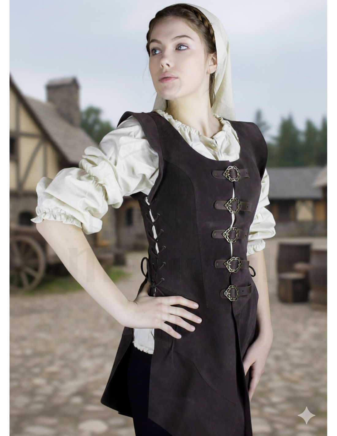 Trauen Sie sich, gleichzeitig elegant und geschützt auszusehen mit der langen mittelalterlichen Lederjacke Julienne. Warten Sie nicht länger und fügen Sie es noch heute Ihrer Sammlung historischer Kleidung hinzu.