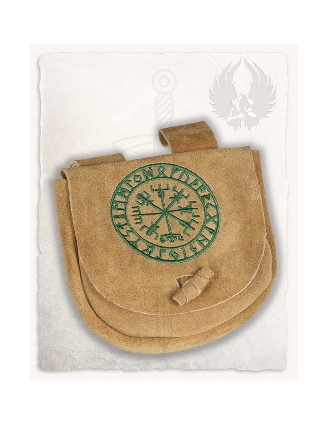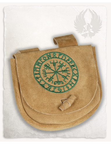 Mit einem doppelten Schlaufen-Design auf der Rückseite lässt sie sich leicht an Taille oder Hüfte anpassen und bietet Sicherheit sowie Praktikabilität bei Ihren Bewegungen. Der Kordelverschluss, ebenfalls aus Wildleder gefertigt, sichert Ihre Sachen auf einfache und elegante Weise. Was dieses Modell jedoch wirklich einzigartig macht, ist die Verzierung mit einem „Vegvisir“, einem isländischen Symbol aus dem 19. Jahrhundert, das laut Tradition den richtigen Weg weist, selbst unter widrigen Bedingungen. Dies verleiht dem Accessoire eine besondere Bedeutung und unterstreicht den abenteuerlichen und erkundungsfreudigen Charakter, den Sie mit sich tragen.