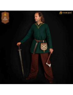 Möchten Sie ein Stück Wikinger-Geschichte mit sich tragen? Diese Wikingertasche aus Leder, inspiriert von den alten Tarsoly aus Birka — dem bedeutenden Handelshafen der Jahrhunderte VIII bis X —, verbindet Stil und Funktionalität mit einem authentischen Touch. Handgefertigt aus hochwertigem Leder, reproduziert sie die eleganten Bronzebeschläge, die die Taschen der Händler und Krieger jener Zeit schmückten, und spiegeln deren Reichtum und Status wider.