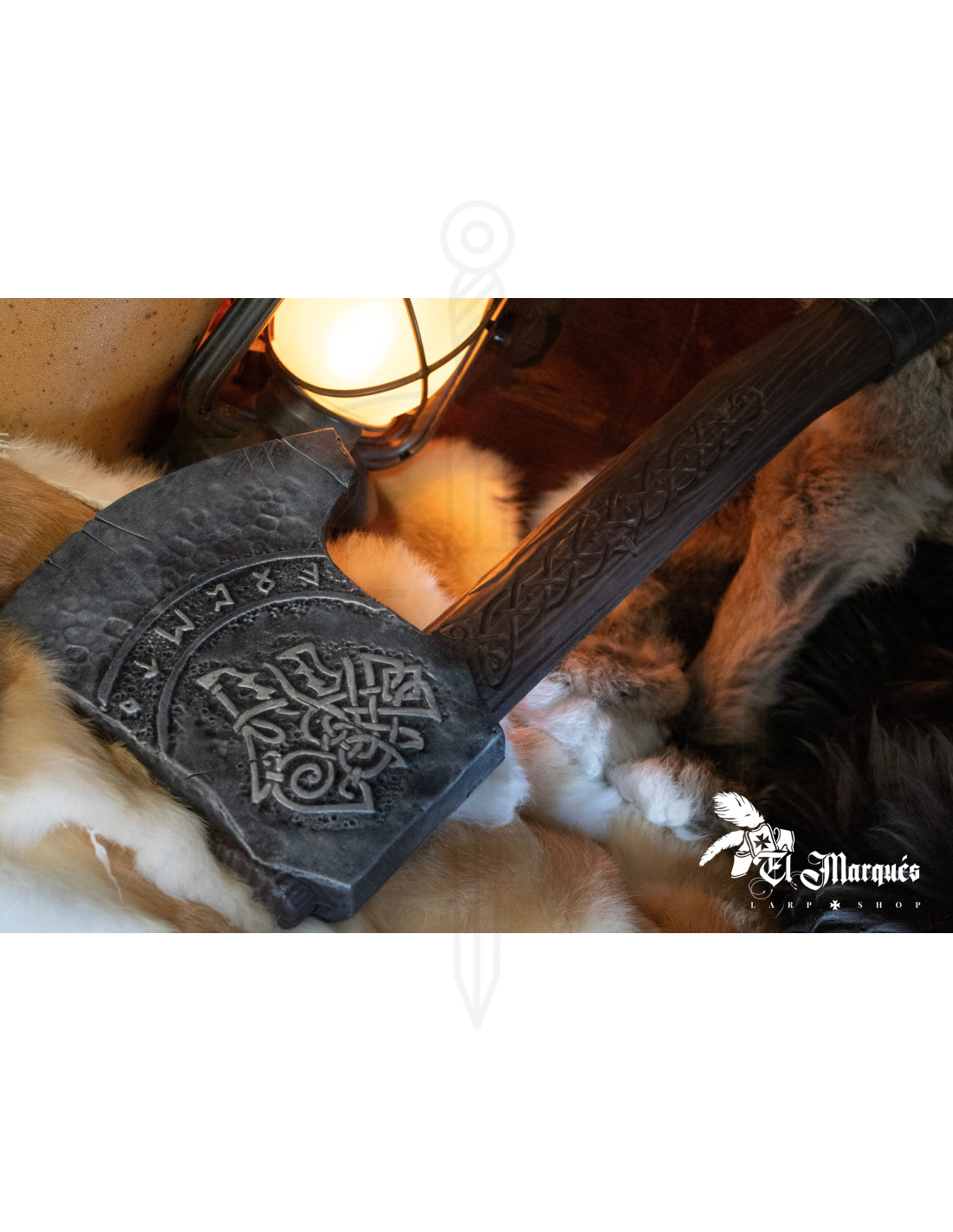Der Kopf der Waffe zeigt Schmiedeeffekte, bearbeitete Schnitte und eine Dekoration mit nordischen Runen und einem Wolf zwischen Wikinger-Knoten, Details, die die persönliche Erzählung deines Charakters verstärken und auf Messen, LARP-Veranstaltungen und Fotoshootings Aufmerksamkeit erregen. Eine Wahl, die auf visuellen Eindruck und thematische Kohärenz in jeder Szene ausgelegt ist.