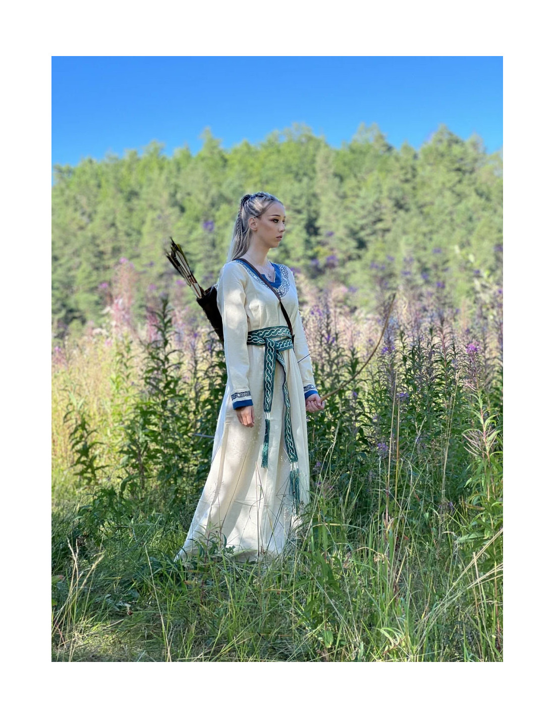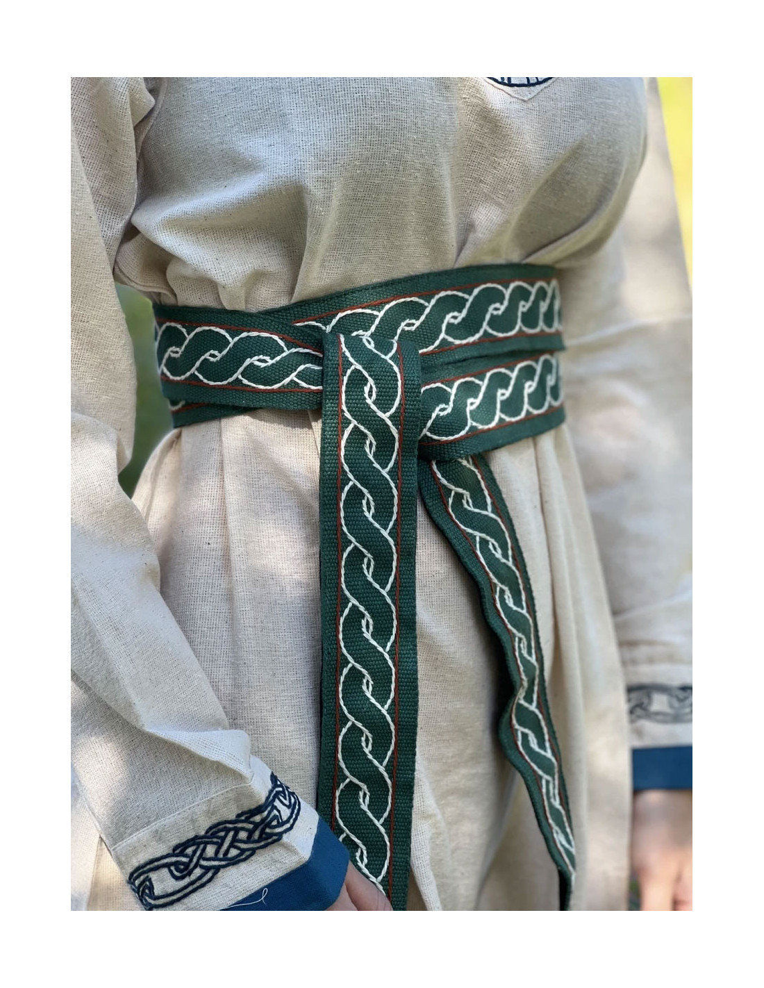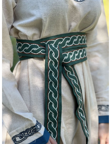 Wenn Sie auf der Suche nach einem hochwertigen Wikingergürtel mit authentischem Design sind, ist das Modell Elina aus grüner Baumwolle die perfekte Wahl. Mit einer Breite von 5 cm und einer Gesamtlänge von ca. 235 cm ist dieser Gürtel lang genug, um unterschiedlichen Taillenweiten und Tragestilen gerecht zu werden. Darüber hinaus ist das von der Wikingerkultur inspirierte Design perfekt, um jedes mittelalterliche Outfit zu vervollständigen und ihm einen Hauch von Authentizität zu verleihen.